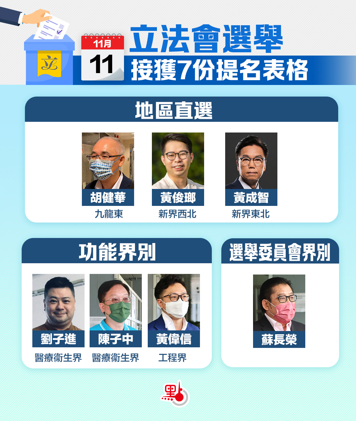 功能界別方面,今日接獲3份提名表格,包括參選醫療衞生界的註冊護士劉子進、香港護理專科學院副院長陳子中;參選工程界的工程師黃偉信。