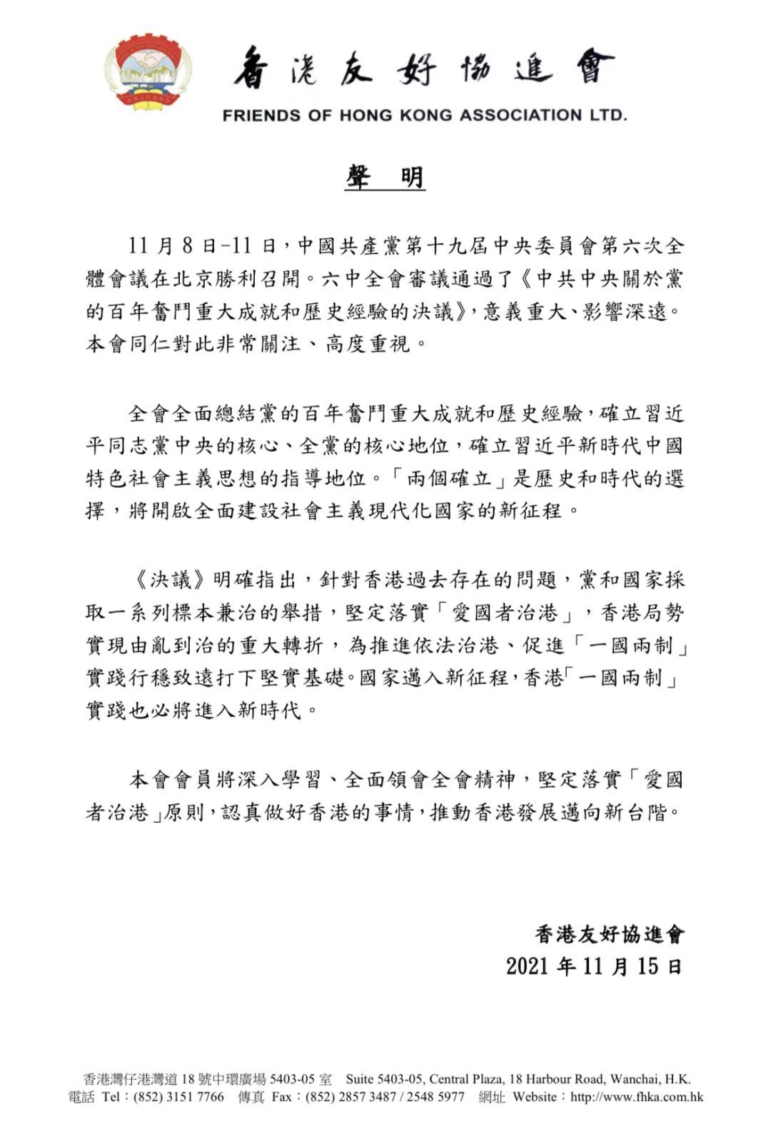 11月8日-11日,中國共產黨第十九居中央委員會第六次全體會議在北京勝利召開。六中全會審議通過了《中共中央關於黨的百年奮鬥重大成就和歷史經驗的決議》,意義重大、影響深遠。香港友好協進會今日(15日)發表聲明,表示對此非常關注、高度重視,將深入學習、全面領會全會精神,堅定落實「愛國者治港」原則,認真做好香港的事情,推動香港發展邁向新台階。