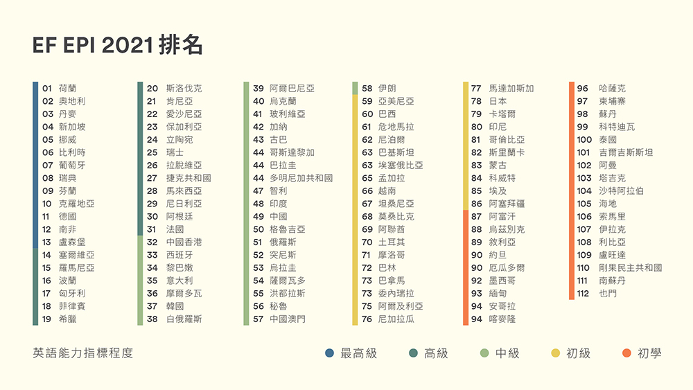 英孚教育(EF)近日發布2021年版的EF英語能力指標,分析112個國家和地區中200萬非英語母語人士的數據。調查顯示,香港特區在亞洲排第4,低於首三位的新加坡、菲律賓和馬來西亞,英語平均水平亦只達中級程度,不及全球第4的新加坡達最高級別。