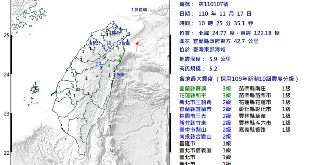 台灣東部海域今(17日)早10時25分發生黎克特制5.2級地震,深度5.9公里,震央位於宜蘭東方42.7公里,最大震度宜蘭縣、花蓮縣3級。當地暫時未傳出任何因地震引發的傷亡報告。
