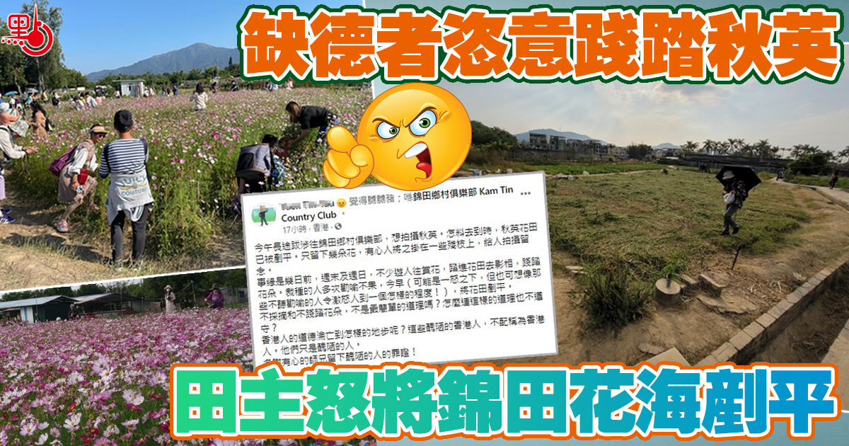 踏入深秋,本港仍然較為溫暖,在錦田鄉村俱樂部,一大片秋英(波斯菊)盛開,偌大的花海近日吸引不少人前往賞花及「打卡」。不過,有網民在社交平台上載圖片,秋英花田已被剷平,只留下幾朵花,有心人將之掛在一些殘枝上,給人拍攝留念。