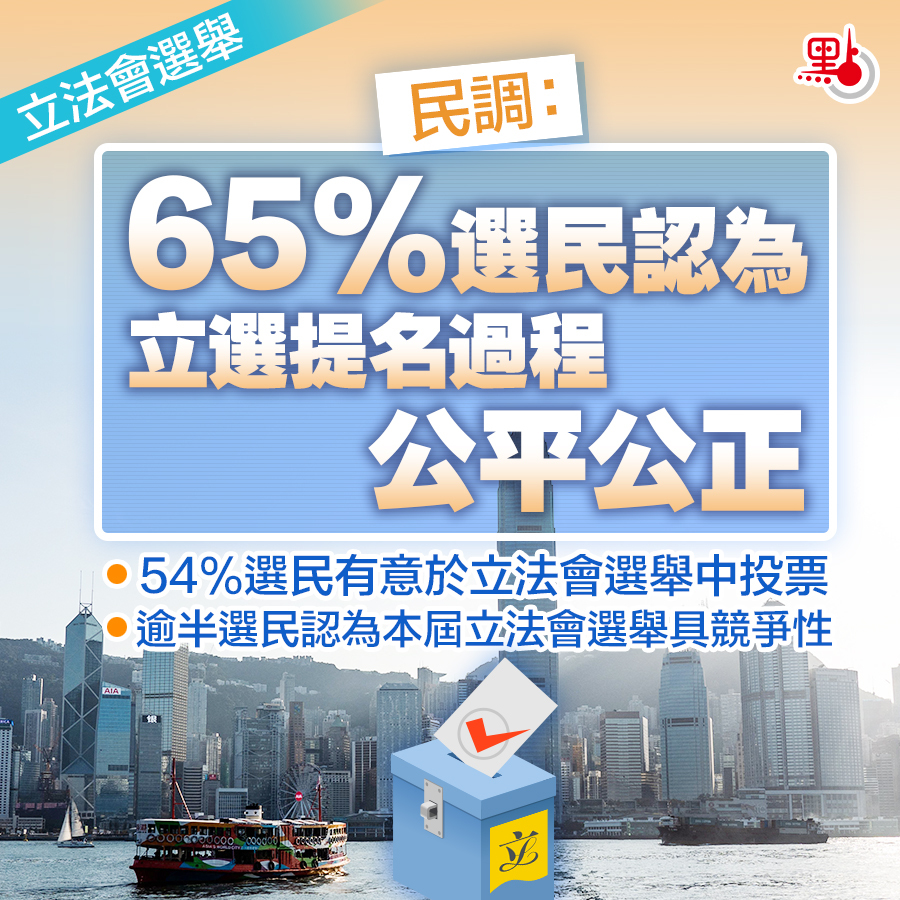 香港研究協會就此於11月12至16日展開全港性隨機抽樣電話訪問,成功訪問了1067名登記選民,以了解選民對立法會選舉的意見。民調結果顯示,56%的受訪者認為本屆立法會地區直選選舉「有競爭性」,認為選委會界別選舉及及功能界別選舉「有競爭性」的則分別佔到了52%和61%。協會指,五成六選民認為地區直選具競爭性,相信與今次立法會選舉各地方選區、各界別皆出現競爭,沒有自動當選的情況出現有關。