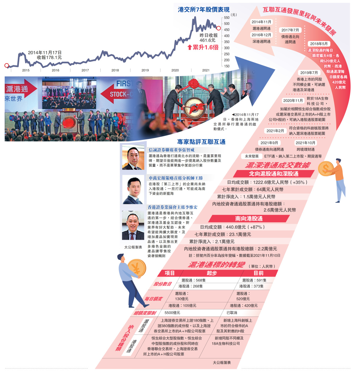 2014年11月17日,連接香港和上海股票市場的滬港通機制啟動,讓兩地投資者首次在不改變本地市場交易習慣的原則下,方便快捷地直接參與對方市場,開啟了中國資本市場雙向開放的新時代。隨後深股通及債券通亦陸續推出。經過7年的平穩運行,滬深港通成交持續活躍、屢創新高,已經成為中外投資者跨境資產配置的主要渠道。