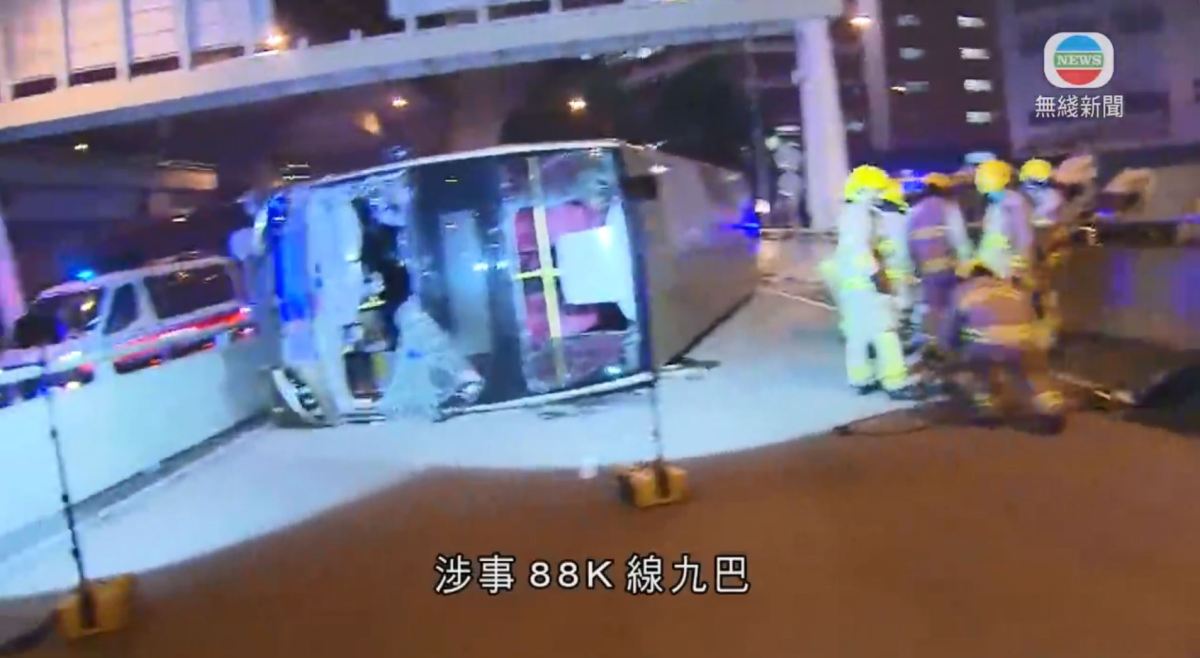 事發於昨晚深夜11時許,肇事的88K九巴駛至青沙公路與大埔公路交界時,剷上石壆翻側,巴士上層一名37歲男乘客被車身壓住,頭部受創,當場死亡,另外包括司機在內的2男9女受傷,年齡19至70歲,當中2名女子情況嚴重,其餘分別擦傷或扭傷。警方懷疑九巴司機行錯路導致意外,會循多方面調查,包括司機的精神健康狀況及車速。