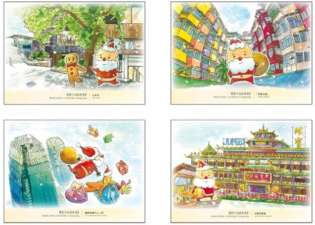是次發行的一套四枚郵票,展示聖誕老人到香港受歡迎的電影場景展開「朝聖之旅」,細味香港文化特色。郵票上的聖誕老人帶着薑餅人經過中環九如坊,輕歌曼舞,為社區帶來歡聲笑語;又瞬間在國際金融中心二期的天際漫天飛翔,在香港上空派送愛的禮物。其後到訪「打卡」勝地「怪獸大廈」的天井拍照留念;這五幢大廈密密麻麻地靠着,構成獨特的城市街景。忙活過後,聖誕老人乘坐接駁小輪前往珍寶海鮮舫與好友相聚,滿載歡樂。