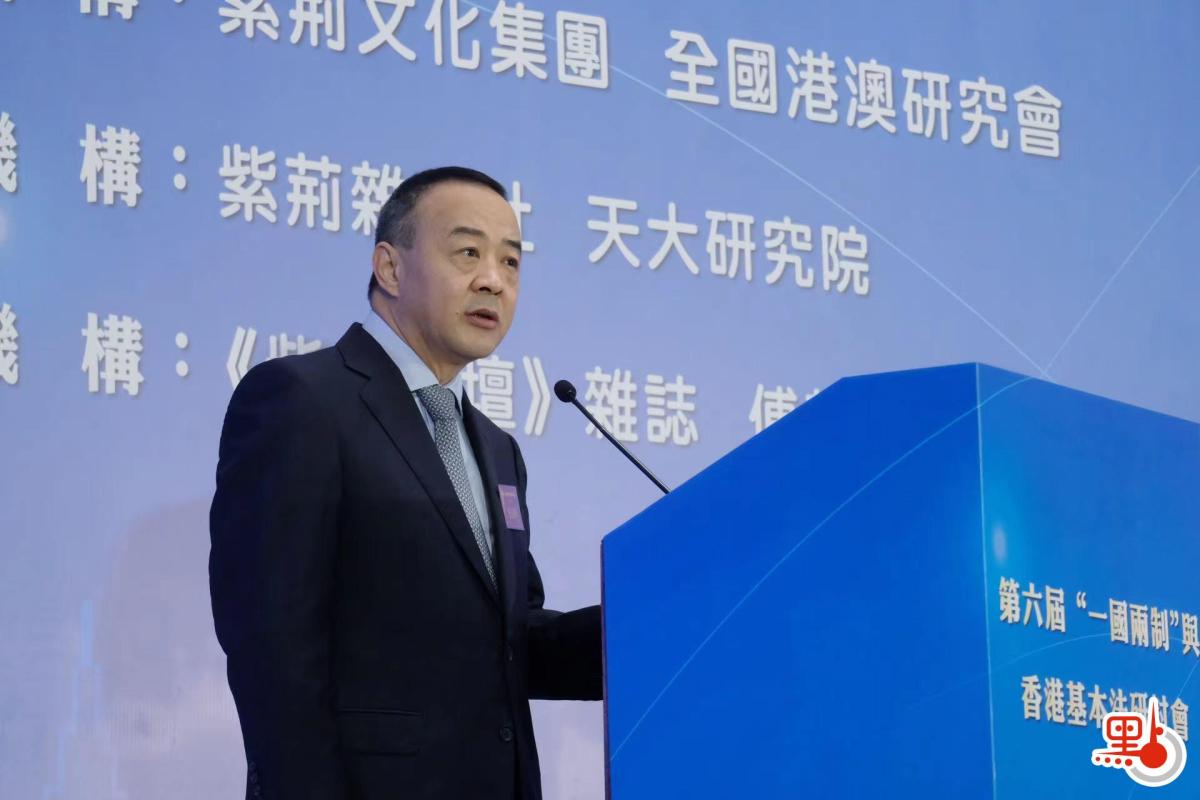 紫荊文化集團董事長毛超峰代表主辦方致詞時表示,不久前召開的中國共產黨十九屆六中全會審議通過了《中共中央關於黨的百年奮鬥重大成就和歷史經驗的決議》,其中指出,在堅持「一國兩制」和推進祖國統一上,中央實施一系列標本兼治的舉措,推動香港局勢實現由亂到治的重大轉折,為推進依法治港、促進「一國兩制」實踐行穩致遠打下了堅實基礎。在這個重要時刻召開研討會,可謂恰逢其時,相信大家也會有很多新體會和新思考,能在研討交流中相互碰撞、凝聚共識,為「一國兩制」的實踐提供寶貴的理論借鑒。