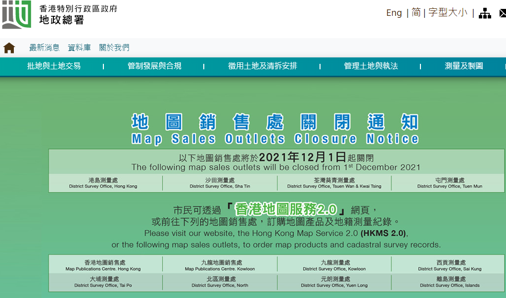地政總署今日(23日)宣布,由12月1日起關閉4個分別位於灣仔修頓中心、沙田政府合署、屯門政府合署和荃灣政府合署的地圖銷售處。