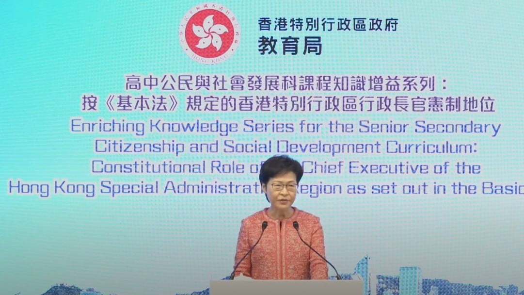 行政長官林鄭月娥今日(25日)在公民與社會發展科的教師培訓課程主講,題目為「按《基本法》規定的香港特別行政區行政長官憲制地位」。林鄭月娥表示,香港自古以來是中國的一部分,所以不難理解當香港有人鼓吹國家分裂、「民族自決」、「港獨」時,會引來全國人民有強烈反彈。