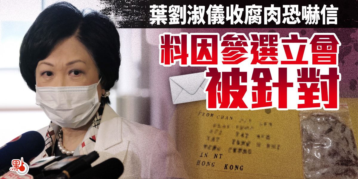 近日司法機構人員及政界人士收到恐嚇信事件頻頻發生。立法會選舉港島西地方選區候選人、新民黨主席葉劉淑儀,昨日(24日)晚上亦收到類似信件,而信封郵票來自台灣。葉劉淑儀接受查詢指,自己今(25日)早已經報警處理,相信騷擾可能是針對選舉工程,「想我唔選」,又或者因為她曾批評過「台獨」。她表示,收信後一度擔心會否有炭疽菌,近日擺街站亦會小心。