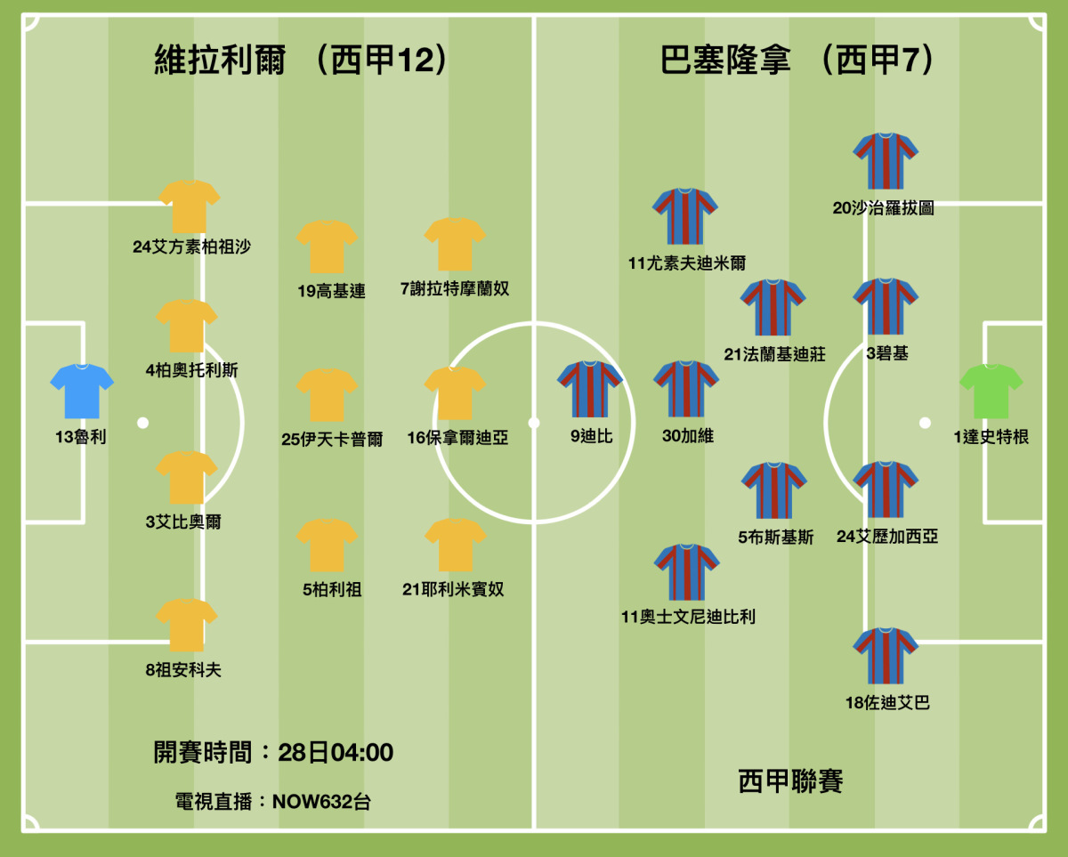 巴塞隆拿在名宿沙維領軍之後,分別於聯賽和歐聯進行了一場比賽,雖然僅取得1勝1和成績,但共通點是保持不失波。預計面對頑強的維拉利爾,沙維仍會採取穩中求勝的戰略術,先做好防守再謀贏波良機。 (香港時間周日凌4時開賽,NOW632台直播)