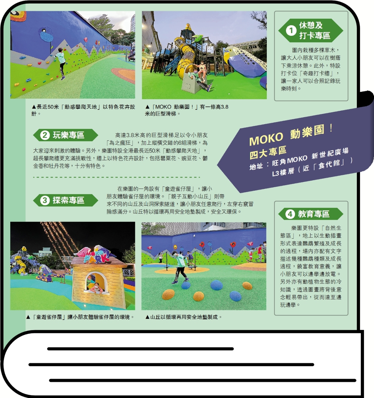 「MOKO 動樂園!」位於「MOKO 新世紀廣場」L3樓層,本月以全新面貌登場,除了有一系列好玩刺激的遊樂設施,樂園設計更融合了旺角地區特色,添加動植物生態及多元環保概念,實行寓教於樂。「MOKO 動樂園!」佔地近18000平方呎,提供玩樂、探索、教育、休憩和打卡等多元化消閒體驗。其中包括有近50米的全港最長攀爬牆、8米高的大型遊樂設施、由山丘及山洞組成的探索隧道及6組不同高度的滑梯,最高的一組滑梯高達3.8米,既刺激又能夠「放電」。