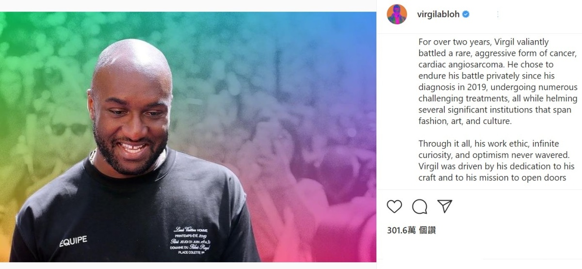 官方社交媒體聲明如下:「兩年多以來,Virgil英勇地與一種罕見、侵略性的癌症cardiac angiosarcoma(一種心臟血管腫瘤)搏鬥。 自2019年確診開始,他選擇私底下進行這場抗癌戰爭,經歷多次艱難的治療,這一切發生的同時,他執掌着幾家跨越時尚、藝術和文化的重要機構。他的職業道德、無盡好奇心和樂觀精神從未動搖過。」