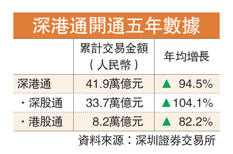 深交所引述交易數據指,五年來兩地市場機構和投資者積極參與深港通,推動交易規模快速增長。