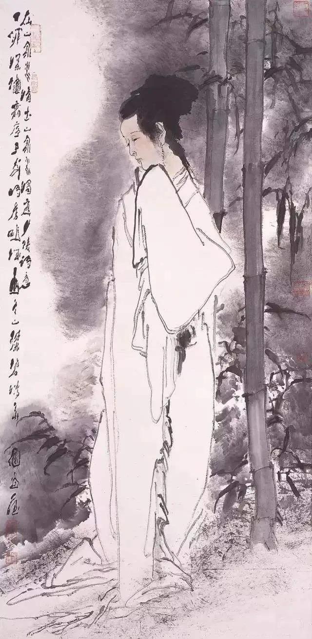 另外印象特別深的還有一張仕女畫,流暢的線條仍然區別於結構的真實狀態,而且是高度冼練,給予行雲流水的線條以充分的表現力,背景的竹子以及烘染的一塊無形的墨色,都是那麼恰如其分地烘託了人物的意境;再有一張震撼到我的是他畫的屈原投江的那張作品,這是一張王老少有的闊筆沒骨的大寫意作品,他理解屈原,崇尚屈原的人格,屈原那股子倔強勁兒,正與他自己十分相似,那種悲愴情懷也與王老的性格相契合。他畫屈原,是在畫他自己。我能想像得到他作畫時的癲瘋狀態,下筆如洶湧的黃河壺口在咆哮——嗚嗚嗚地轟鳴着完成那闊筆的潑墨,那是屈原,也是王子武。這是我看到的畫屈原作品中最受感動的一張。