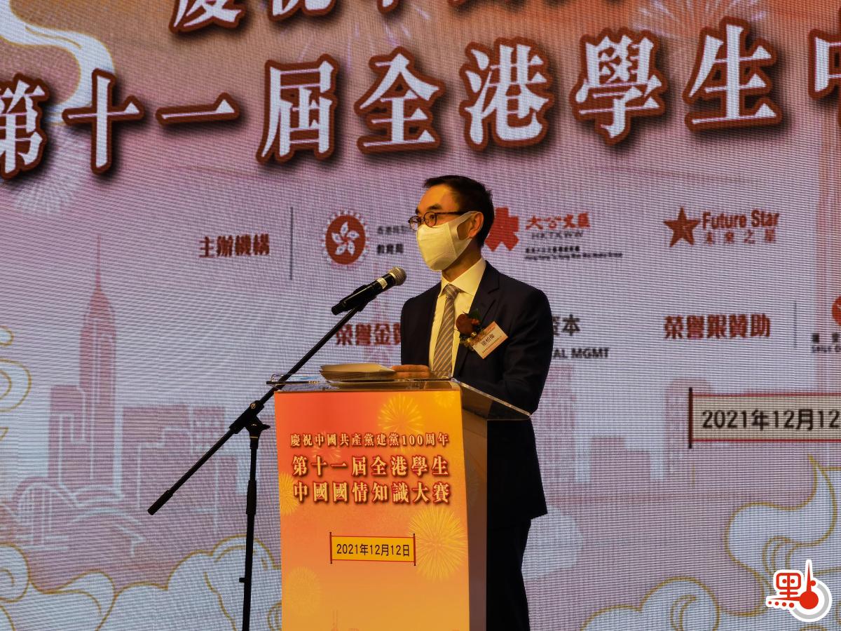 由香港教育局、香港大公文匯傳媒集團和未來之星同學會聯合舉辦的「第十一屆全港學生中國國情知識大賽」,今日(12日)下午舉行頒獎典禮。香港特區政府教育局首席教育主任梁柏偉在致辭中表示,維護國家安全是香港師生的責任,可以從法與情兩方面出發建立學生對國家的歸屬感和國民身份認同。