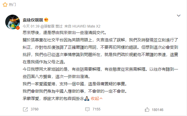 袁詠儀在微博上表示:「思來想後,還是想由我來做出一些澄清與交代。關於張慕童在社交平台因為英語用語上,失言造成了誤解,我們及時發現並立刻進行了糾正,亦對他反覆強調了正確嚴謹的用詞,不要再犯同樣的錯誤。但想到這次必會受到批評,我們也已從這次事情意識到問題所在,就是我們疏於規範他不嚴謹的表達,這實在是我倆作為父母之過。」