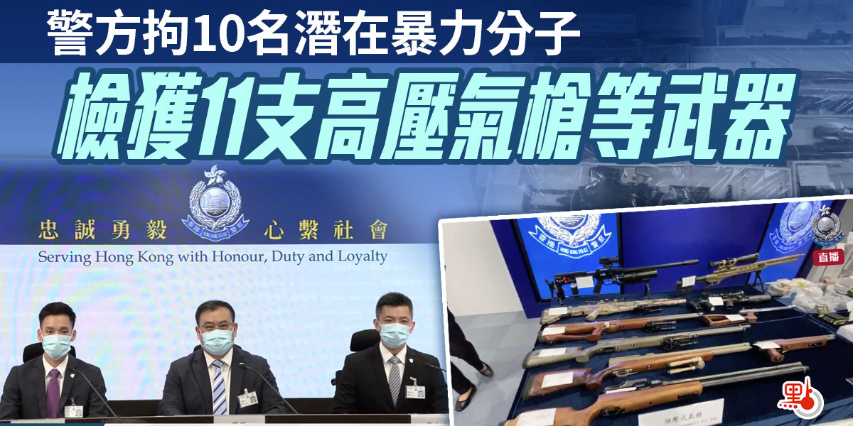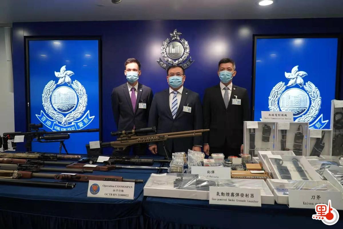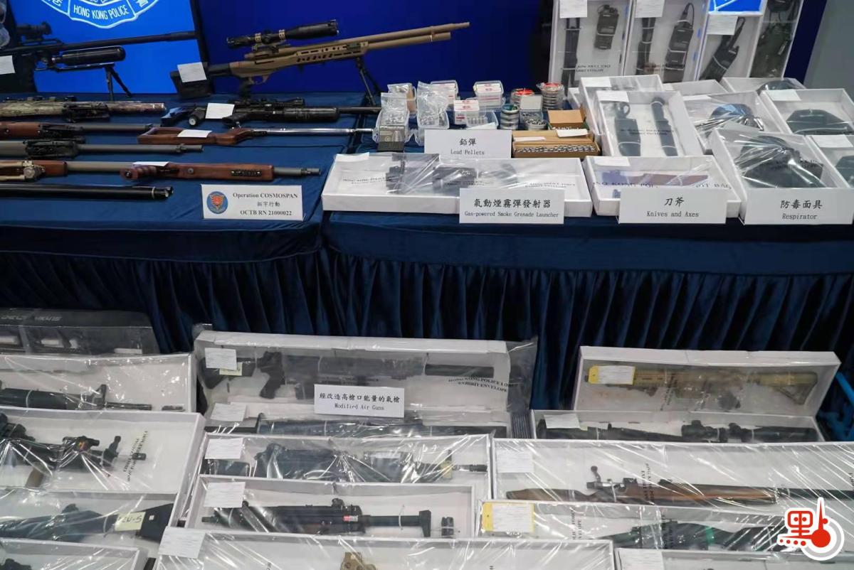 警方表示行動中搜獲11支預壓式高壓氣槍,亦有煙霧彈發射器、軍用防毒面具、濾罐、防彈板等。其中一支預壓式高壓氣槍發射每發子彈的能量高達2000焦耳,足以粉碎磚頭,可造成致命傷害,外國有打獵人士就用以將成年的鹿擊斃,顯示潛在破壞力非常高,性能比真槍實彈的步槍還要高。