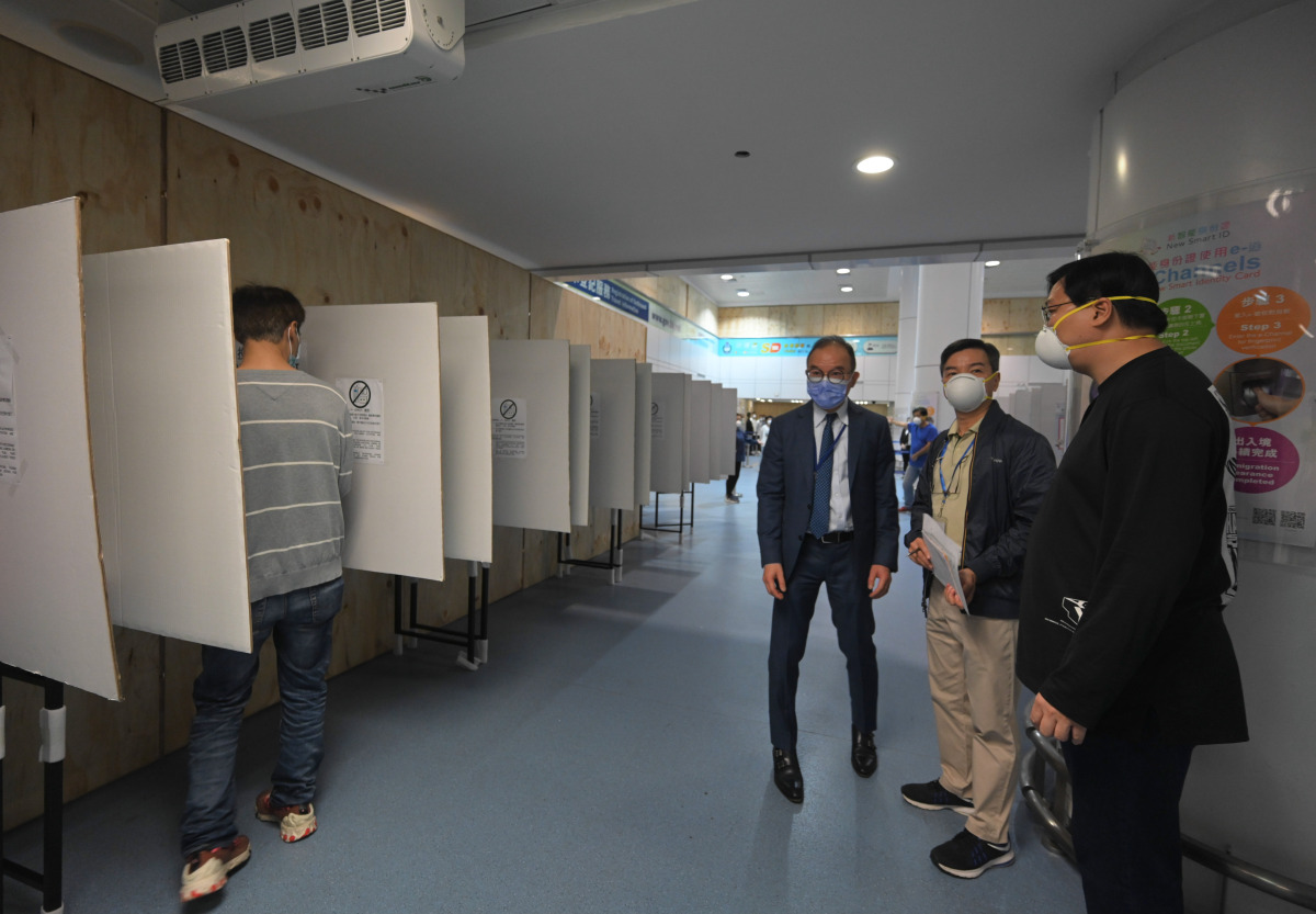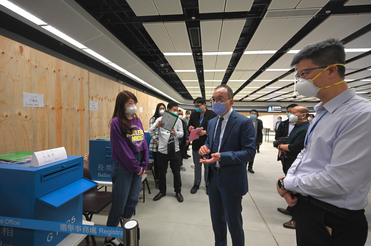 政制及內地事務局局長曾國衞今日(16日)到訪3個邊境管制站投票站,聽取選舉事務處工作人員匯報有關邊境管制站設投票站的具體安排和進行實地視察。