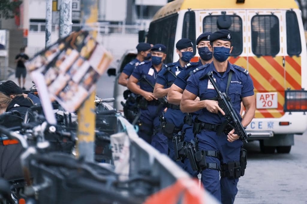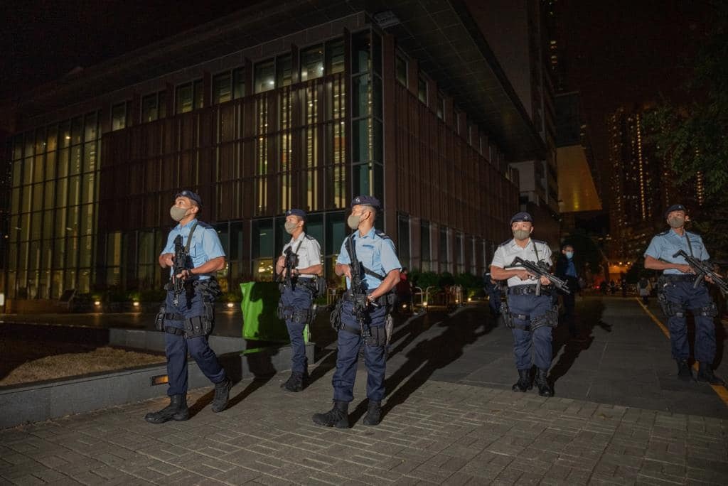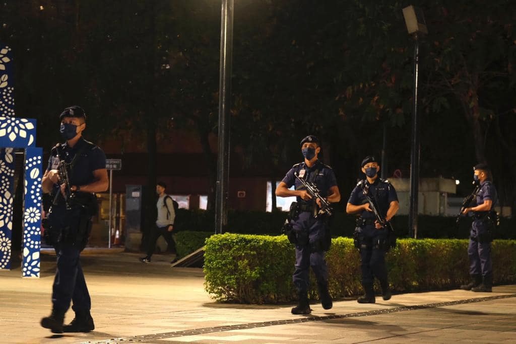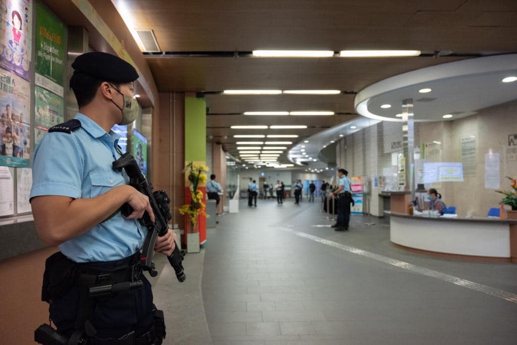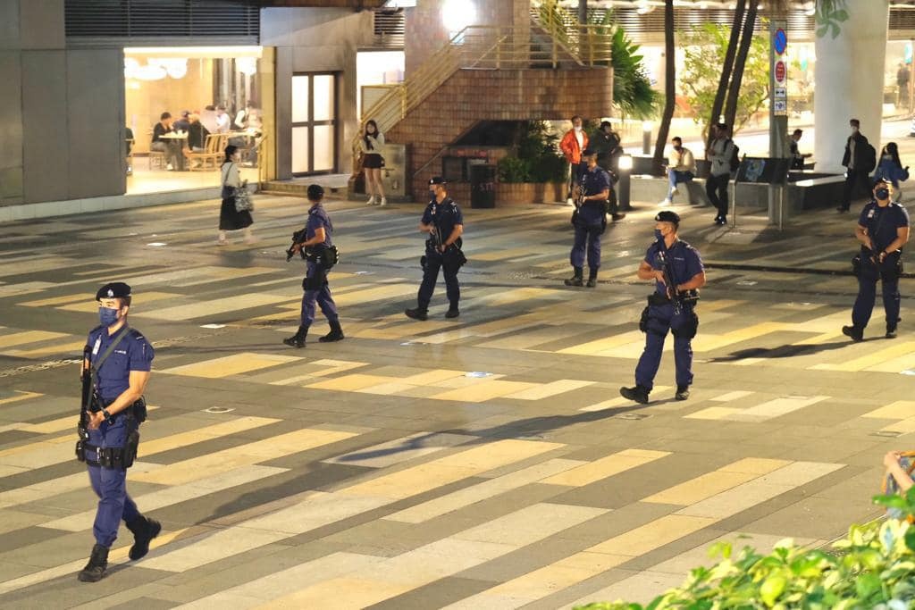 其中在中環中心、九龍公園及調景嶺的投票站外,下午至入夜時分均有大隊軍裝警員在場戒備。他們帶同警犬,並配備衝鋒槍,在票站內外來回巡視。