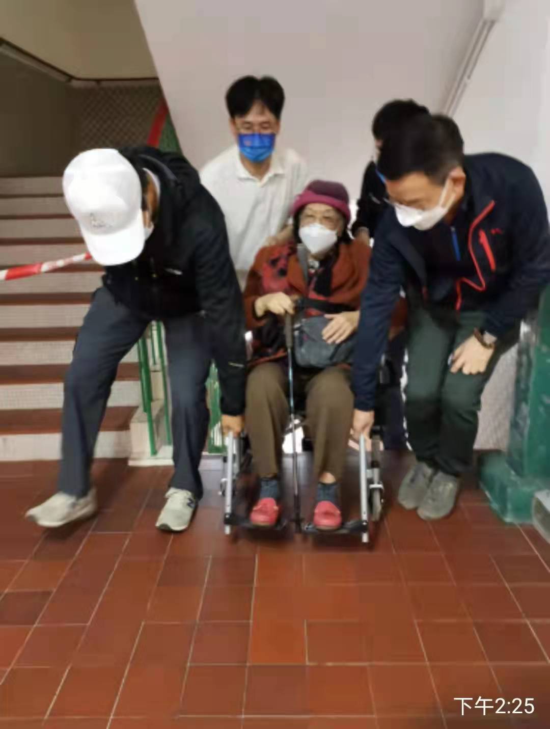 其中,中銀97歲的抗日老戰士、老同事李月波大姐,因行動不便安排義工推輪椅陪同去投票,需經過一段斜坡才能到達票站,因規定不允許推上去,義工及同事就抬着李月波大姐上了20多級台階到達票站完成投票。
