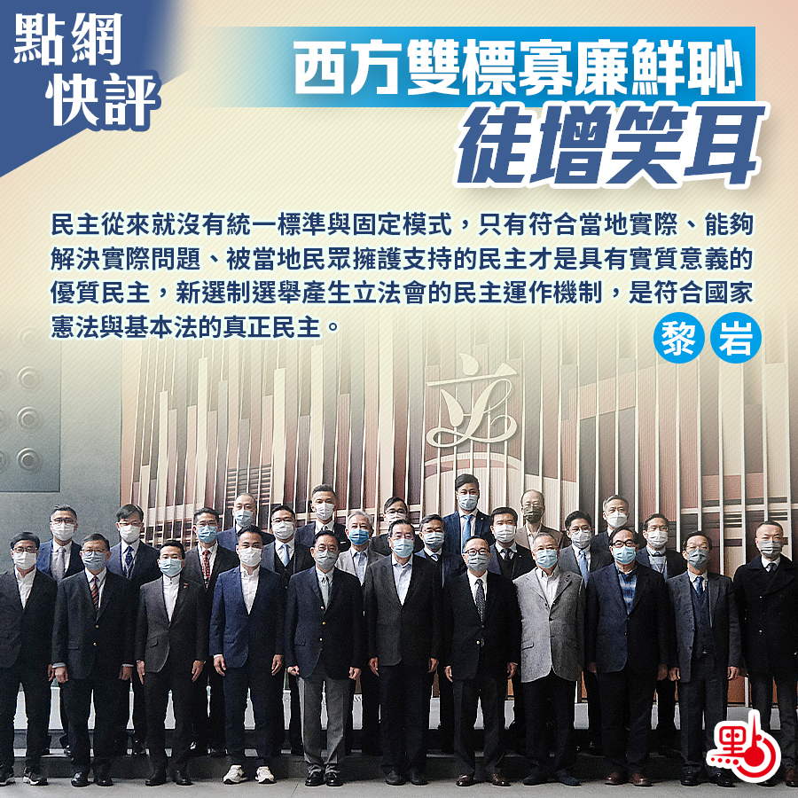 民主從來就沒有統一標準與固定模式,只有符合當地實際、能夠解決實際問題、被當地民眾擁護支持的民主才是具有實質意義的優質民主,而根據完善的選舉制度選舉產生立法會的民主運作機制,是符合國家憲法與基本法確立的香港民主框架,符合「一國兩制」初心、落實「愛國者治港」的真正優質民主。美國對香港中聯辦官員又一次的所謂金融制裁,對於這些盡忠職守的官員而言,不過是廢紙一張,笑料一則。美國裝腔作勢的政治操作,只能暴露了美國當局的昏聵無能,暴露了美國當局的別有用心,暴露了美國當局的無恥嘴臉。寡廉鮮恥的無恥雙標,徒增笑耳而已。