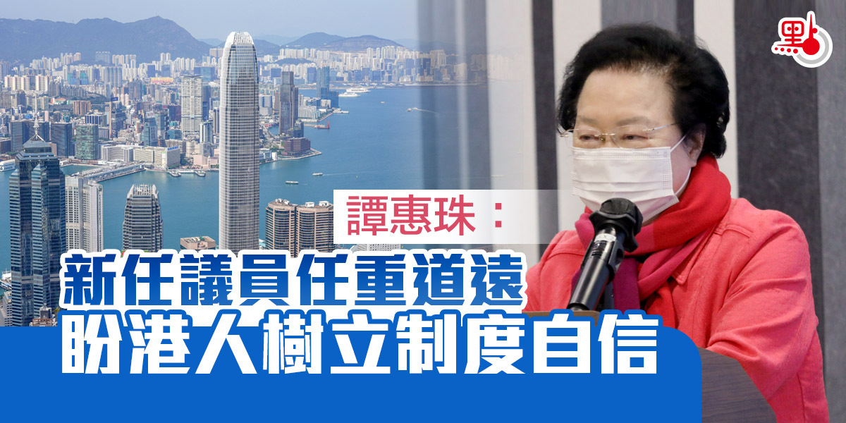 譚惠珠指出,現在新一屆立法會應致力解決房屋土地等問題,需要一批「專才議員」的持續努力,相信經過綜合治理,4年後香港會有更大的發展,令人信服這次選制的改變是成功。她強調,香港需要走自己的民主道路,香港的民主制度必須要合憲、符合國際標準、符合香港需要、符合國策、符合國家及港人利益,希望港人堅定信心,令這次改革獲得成功。