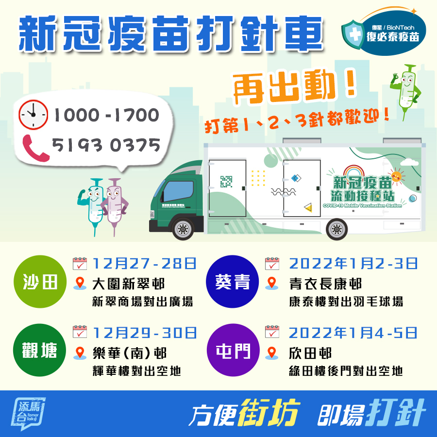 本港21間社區疫苗接種中心聖誕期間照常開放,方便市民在長假期接種新冠疫苗。政府今日(26日)在社交專頁「添馬台」發文,新冠疫苗流動接種車明日(27日)再出動,第二次走訪在月初到過的沙田、觀塘、葵青及屯門區,方便居民打第二針;同時也歡迎市民打第一或第三針,呼籲街坊們尤其是長者和長期病患者快把握機會。