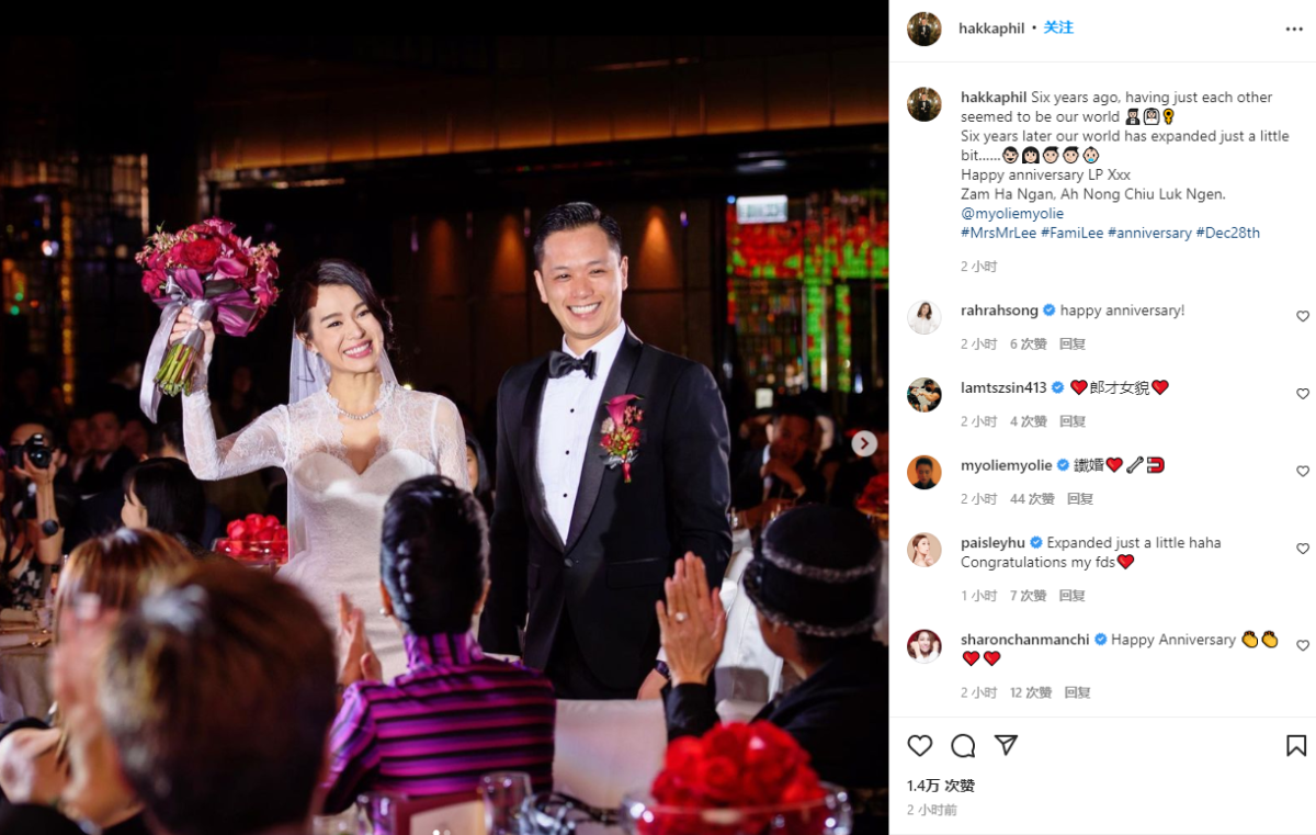 今日(28日)是二人結婚6周年的紀念日,他們相繼在社交網站貼出婚照,Philip分享了兩人的結婚相,以及全家福並以英文留言表示「Six years ago, having just each other seemed to be our world. Six years later our world has expanded just a little bit……Happy anniversary LP Xxx.」大意為六年前只得二人世界,六年後他們的世界變大了一點點。