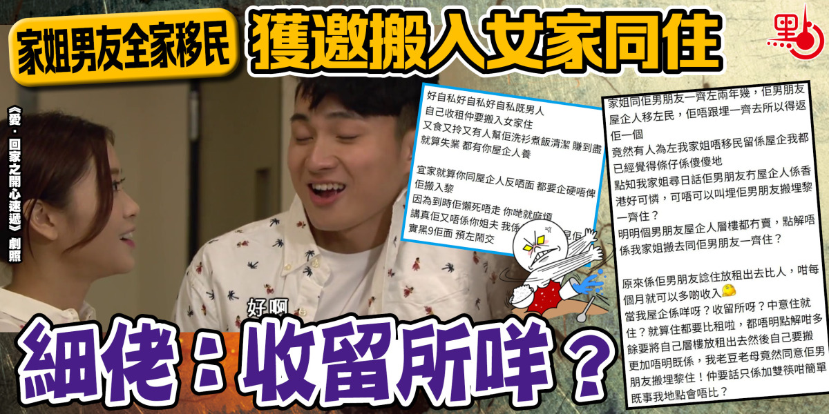 有網民在討論區訴苦,指家姐交往2年多的男友全家已移民,但他卻選擇獨自留港,家姐因為覺得男友「冇屋企人係香港好可憐」,於是邀請男友搬進來與家人同住,好讓對方將本來自住單位放租,增加每月收入,因而引起樓主不滿「當我屋企係咩呀?收留所呀?」