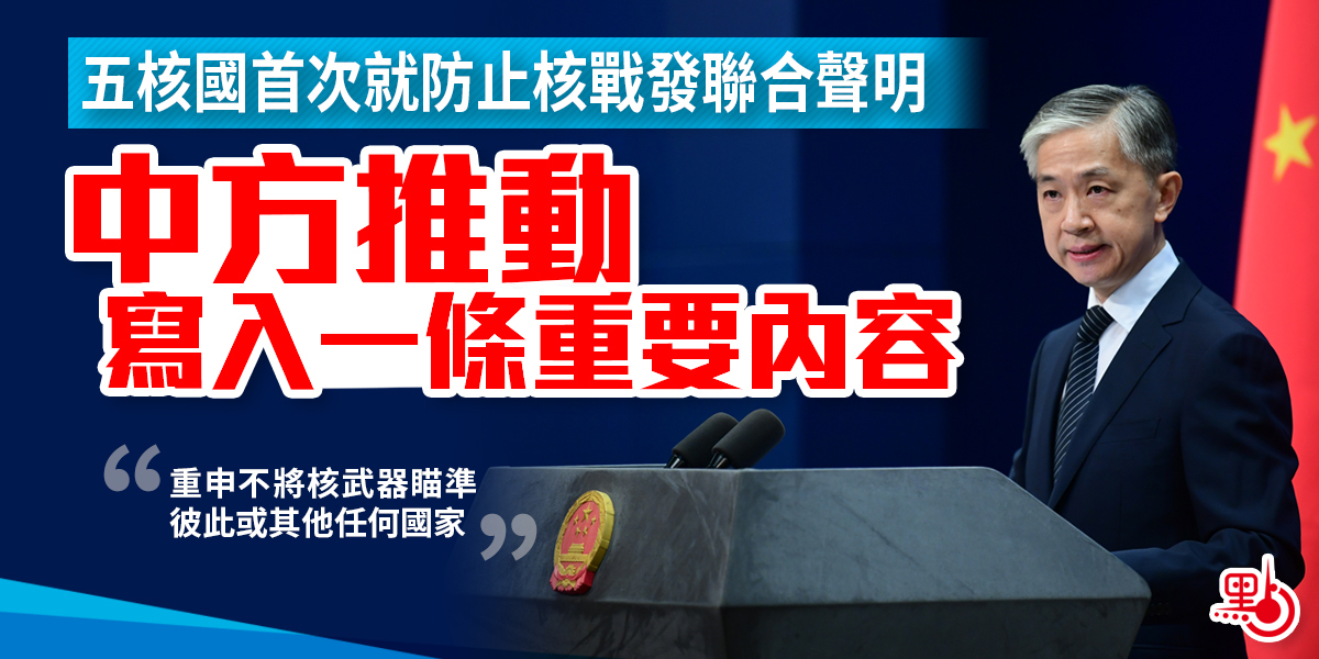 1月3日晚,中、俄、美、英、法五個核武器國家領導人共同發表《關於防止核戰爭與避免軍備競賽的聯合聲明》,申明「核戰爭打不贏也打不得」,重申不將核武器瞄準彼此或其他任何國家,承諾維護和遵守雙多邊軍控協議,強調五國應避免軍事對抗,防止軍備競賽。外交部今日(4日)舉行例行記者會,外交部發言人汪文斌表示,五國領導人首次就核武器問題發表聯合聲明,體現了五國防止核戰爭的政治意願,發出了維護全球戰略穩定、減少核衝突風險的共同聲音,對於構建總體穩定、均衡發展的大國關係也具有積極意義。