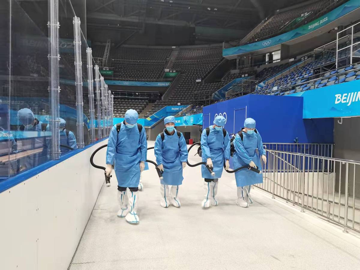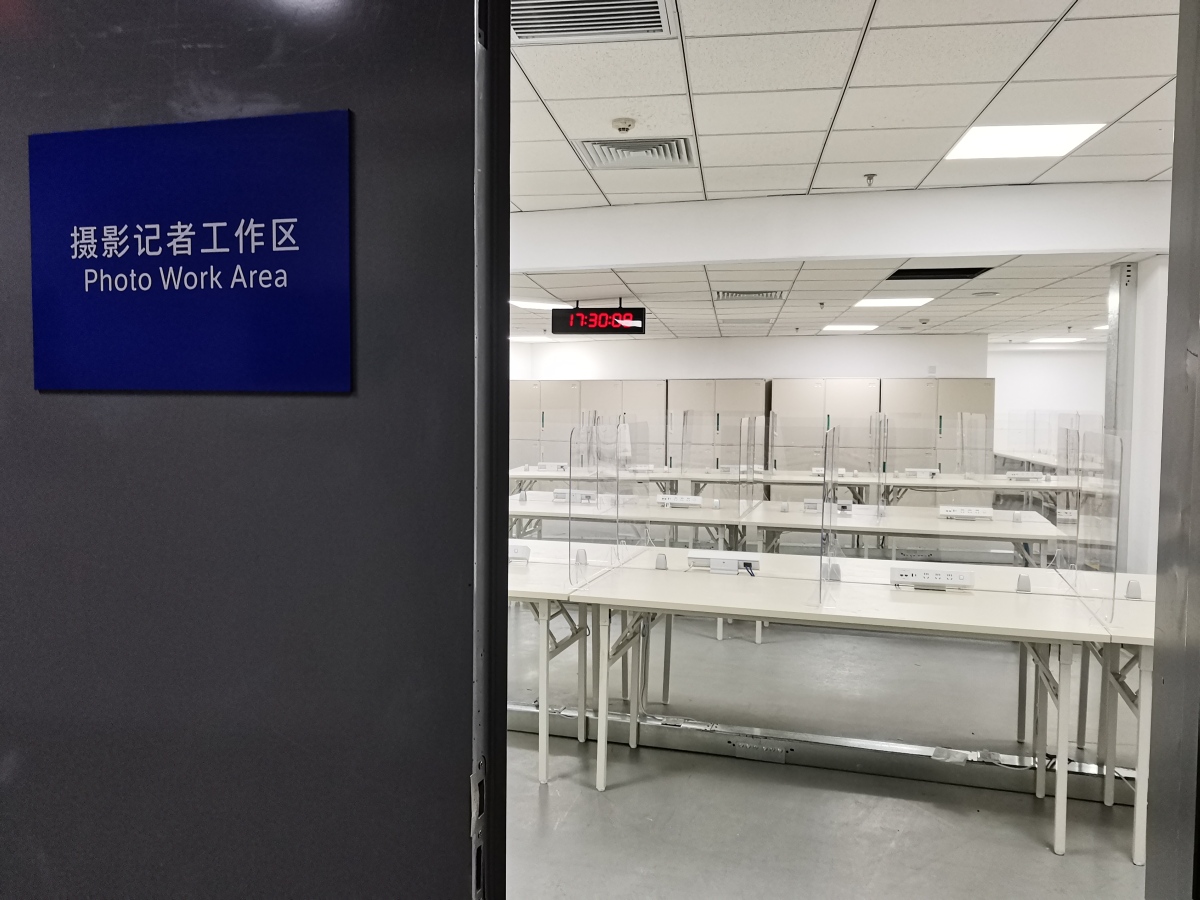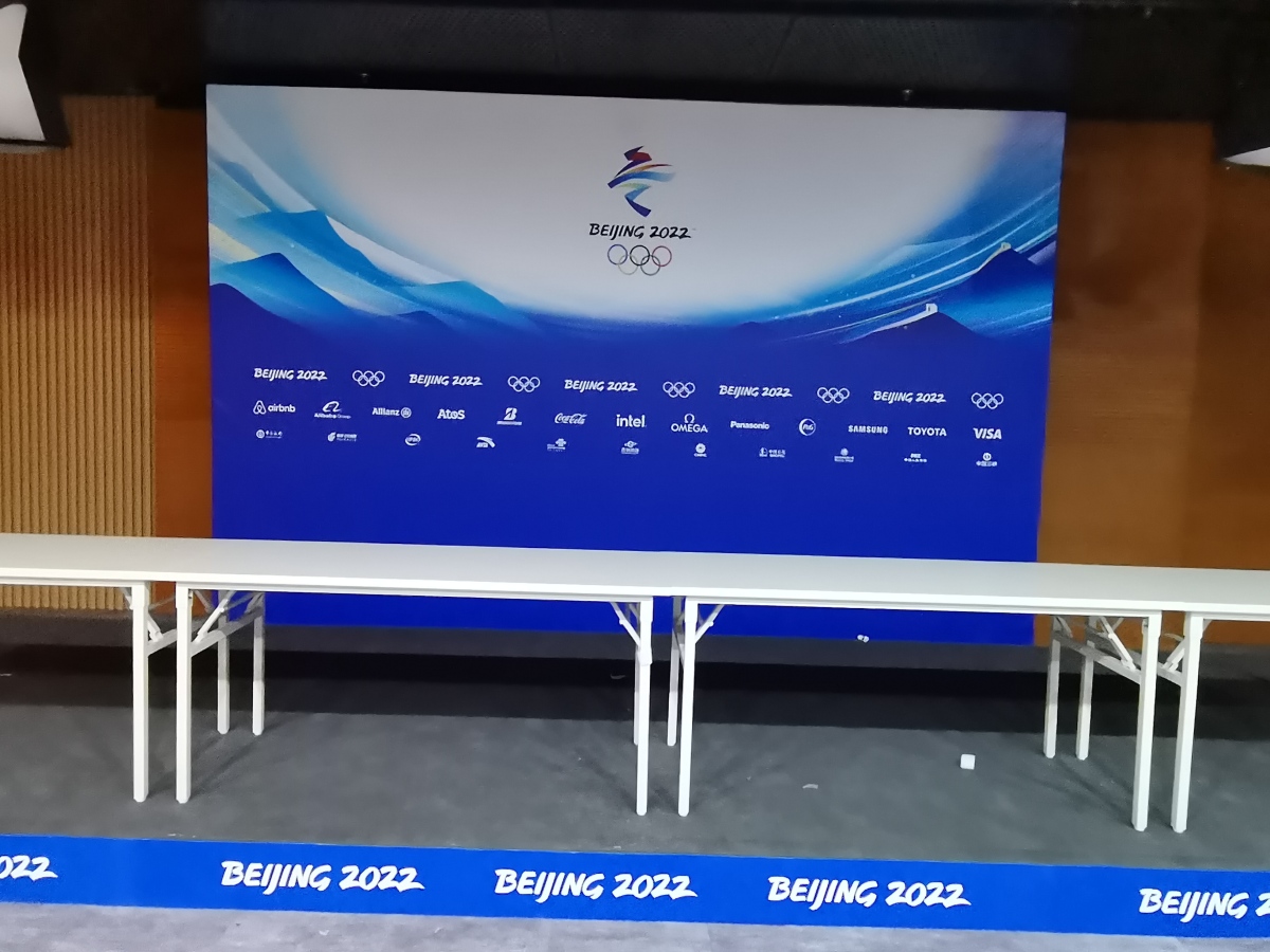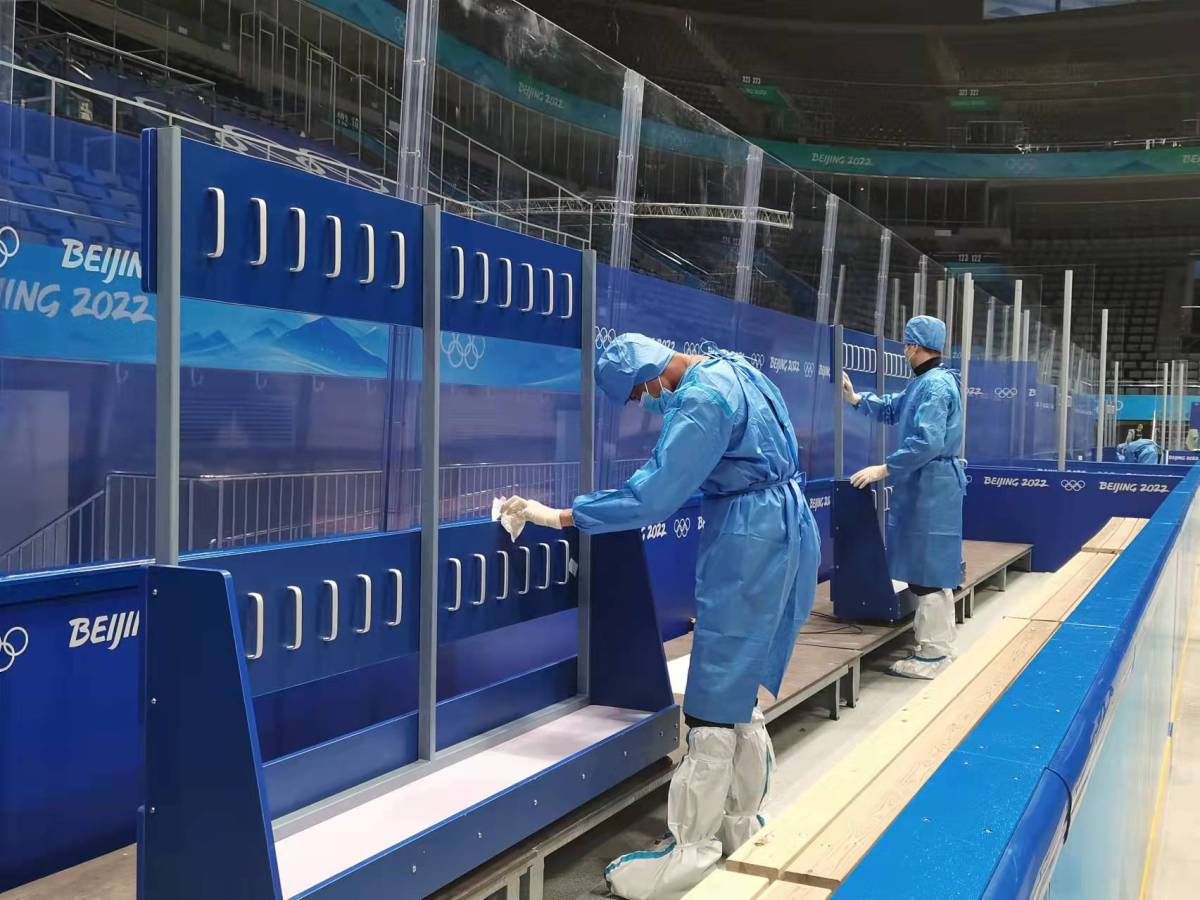 國家體育館場館及通道裏的「相約北京」測試活動景觀已更換成「北京2022」冬奧賽時景觀;媒體混合採訪區的防疫隔板已安裝好,隔離出兩米寬的社交距離;攝影記者間、文字記者間的辦公桌上已安裝好信息島及防疫隔板,儲物櫃亦擺放妥當;運動員更衣室也已增加了可移動式的洗漱小推車。