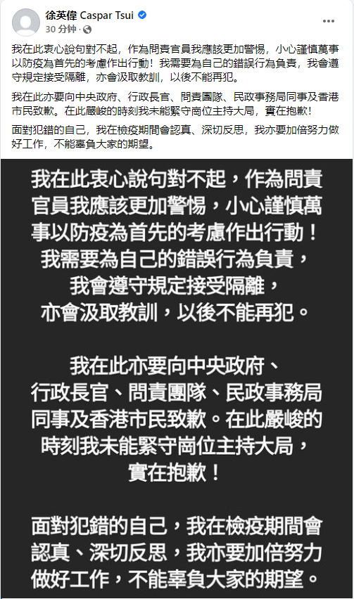徐英偉說,自己在此嚴峻的時刻卻未能緊守崗位主持大局,會在檢疫期間認真、深切反思,亦要加倍努力做好工作,不能辜負大家的期望。