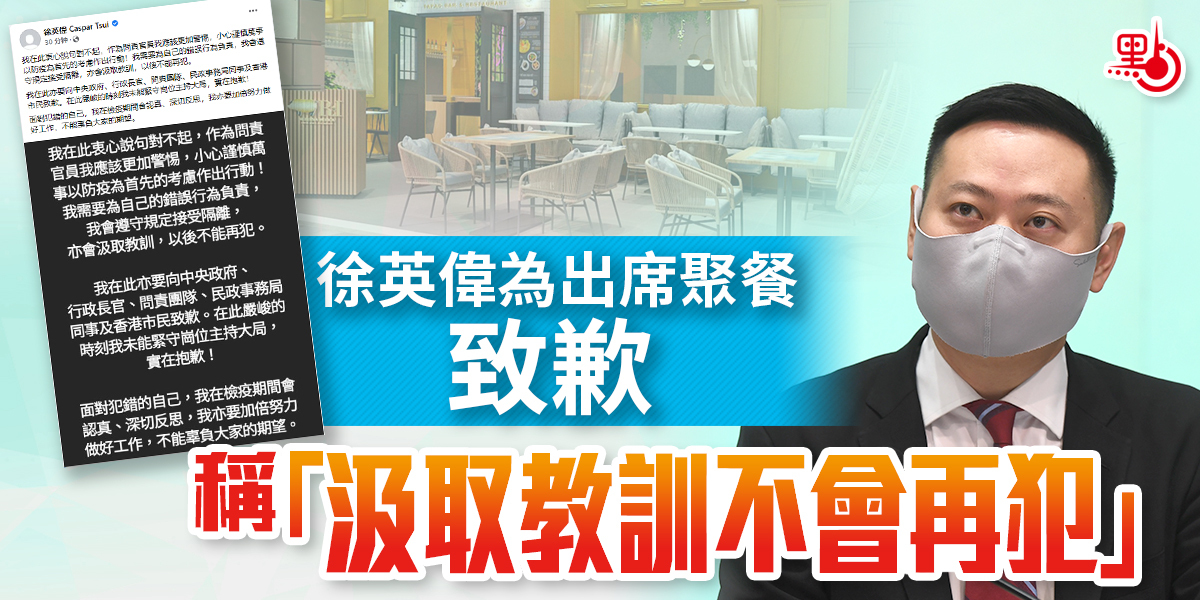 灣仔灣景中心的一間餐廳1月3日舉辦百人聚餐,出席賓客中涉一宗初步確診個案,多名官員曾到場出席聚餐,包括民政事務局局長徐英偉。被列為密切接觸者需送往檢疫中心的徐英偉今日(6日)在社交平台發貼文,向中央政府、行政長官、問責團隊、民政事務局同事及香港市民致歉。
