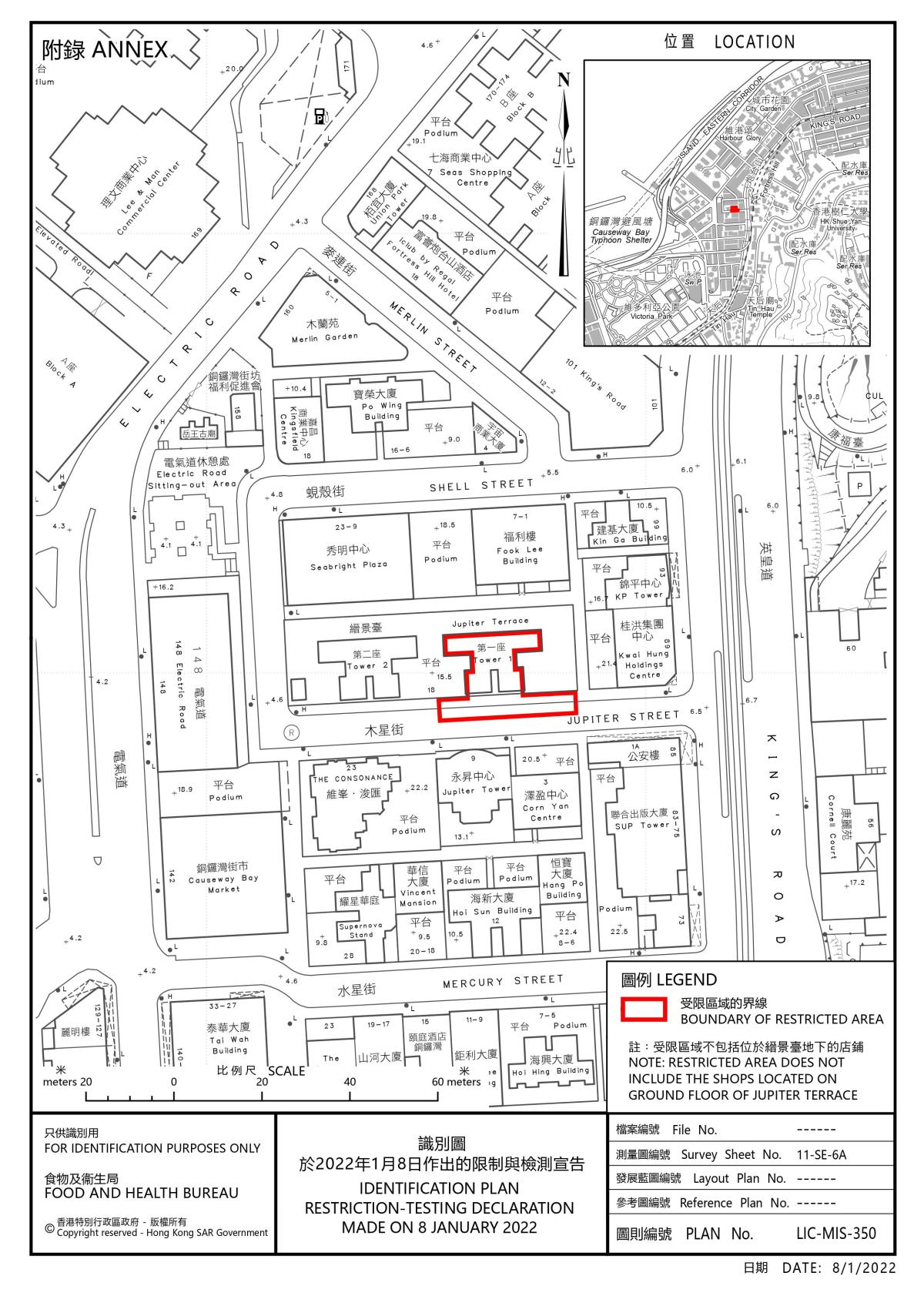 北角雲景道50號富麗園B座方面,受檢人士被要求於今晚11時30分前接受檢測,政府目標是在明日上午約6時30分完成此行動;銅鑼灣木星街18號縉景臺方面,受檢人士被要求於明日凌晨零時前接受檢測,則是在明日上午約7時完成此行動。