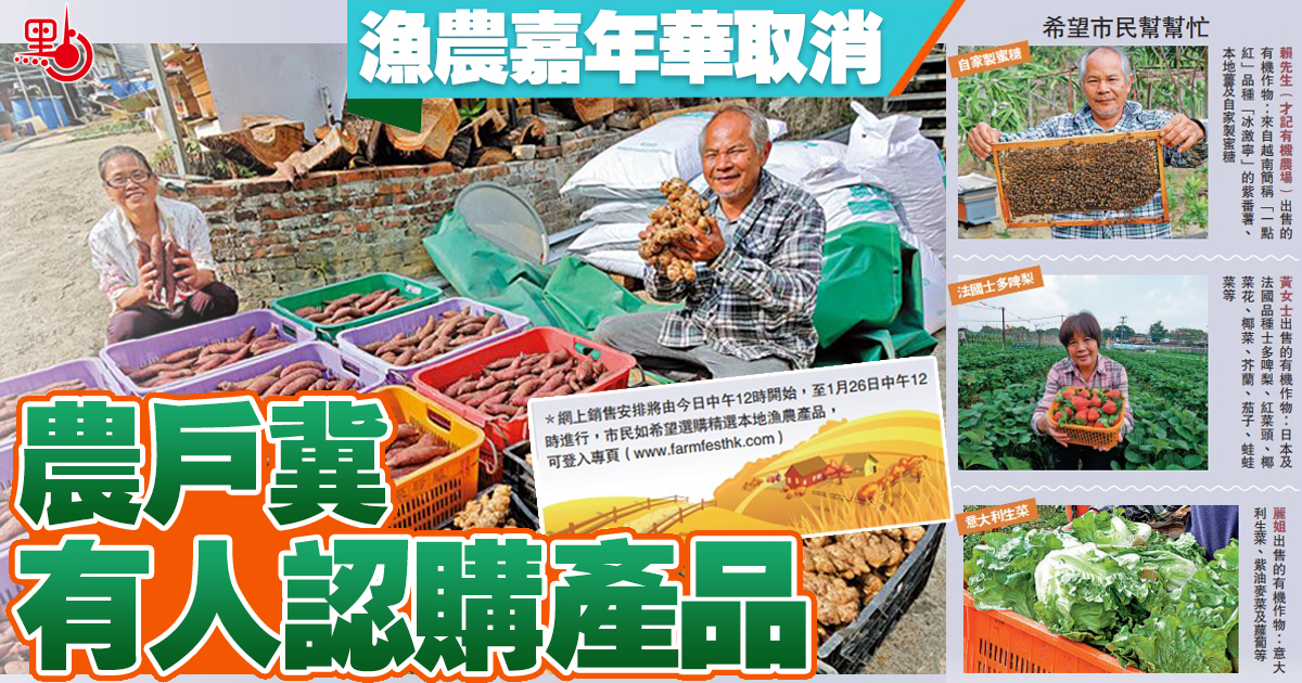 原本上星期五至日在旺角花墟公園舉行的「本地漁農美食嘉年華」因收緊防疫措施被迫取消,改在網上銷售;有農戶向記者大吐苦水,稱原打算今年疫情緩和辦一次有聲有色嘉年華,故「大手」準備,惟活動突然取消,他們損失慘重。有農戶直言,「唔想數以萬斤計本地農作物被當垃圾送去堆填區」,希望市民聯絡本地農場認購。