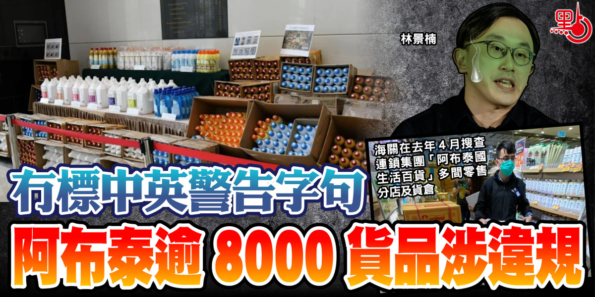 海關在去年4月搜查「黃店」阿布泰國生活百貨多間零售分店及貨倉,檢獲逾8000件懷疑違規個人護理及家居清潔貨品。海關昨日指,行動後接獲約500宗舉報,指市面上多間零售店售賣的貨品,其包裝上的產品資料均沒有標示中文及英文的雙語警告或警誡字句,涉嫌違反《消費品安全條例》。