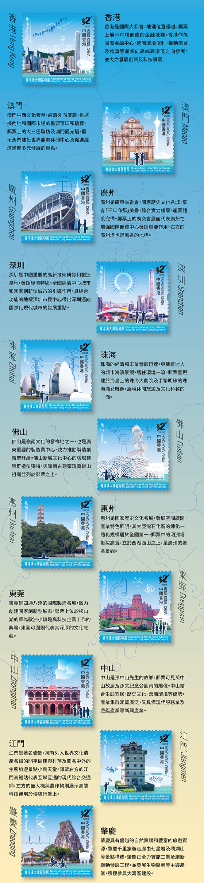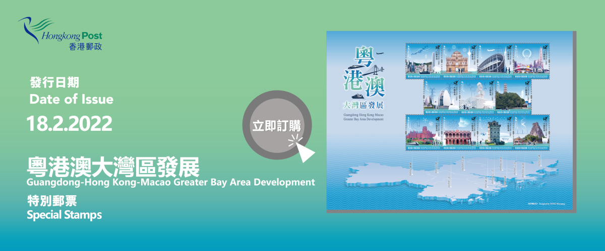 中共中央、國務院在2019年2月18日印發《粵港澳大灣區發展規劃綱要》,為粵港澳大灣區建設提供指導性方向。粵港澳大灣區建設為香港帶來新機遇,讓香港融入國家發展大局的同時,實現自身更好的發展。2022年2月18日為《規劃綱要》公布三周年,香港郵政以「粵港澳大灣區發展」為題,發行一套11枚各面值$2的郵票,分別展示大灣區內香港和澳門兩個特別行政區,以及廣東省廣州、深圳、珠海、佛山、惠州、東莞、中山、江門和肇慶九市的地標及最新發展。