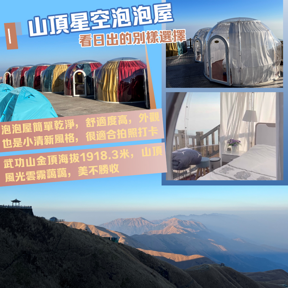 想在山頂看日出,又怕帳篷不夠暖和?江西武功山金頂的星空泡泡屋,成為背包客們眼中新的網紅打卡點。簡單乾淨的小房間不僅舒適度高,外觀也是小清新風格,很適合拍照打卡。房間附近就是視野遼闊的山頂風光,雲霧藹藹,日出夕照,使人挪不開腳步。