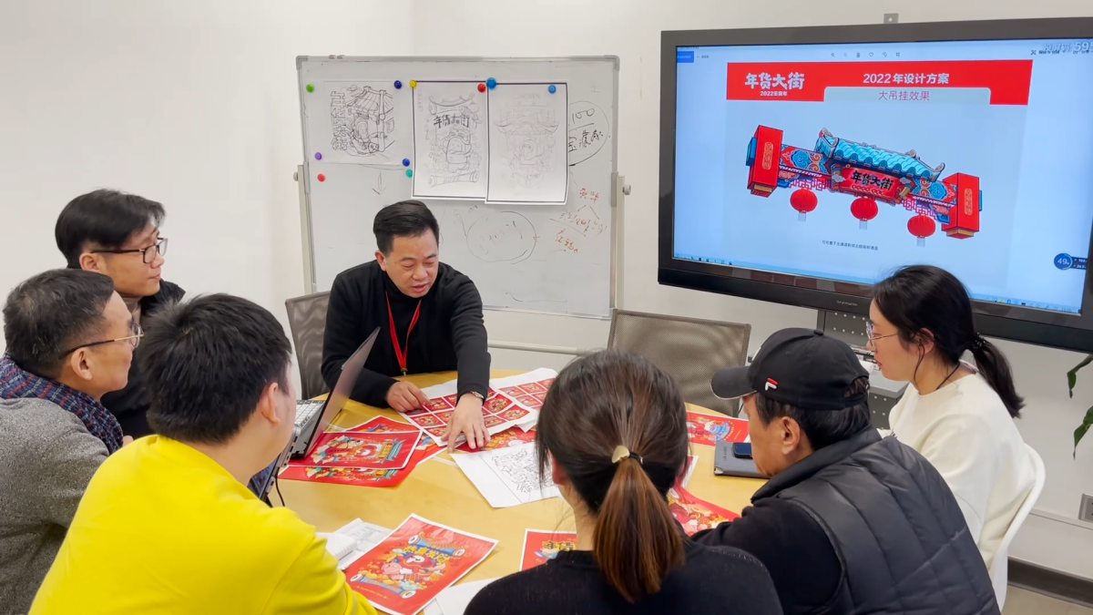 說起程玉剛「年味策劃師」這個名號,還是源自他每年參與策劃設計的超市活動「年貨大街」。2003年,程玉剛首次參與「年貨大街」的設計,憑借對童年春節的記憶,幾個1.2米的鏤空宮燈在他手下誕生了,「在那之前還沒有人做過這個,當時就被領導注意到了,於是我被調來了總部。」後來在一位老師的引薦和指導下,「年貨大街」成了程玉剛每年工作的重中之重,他也頗為自豪地笑言,「還算小有成就吧。」