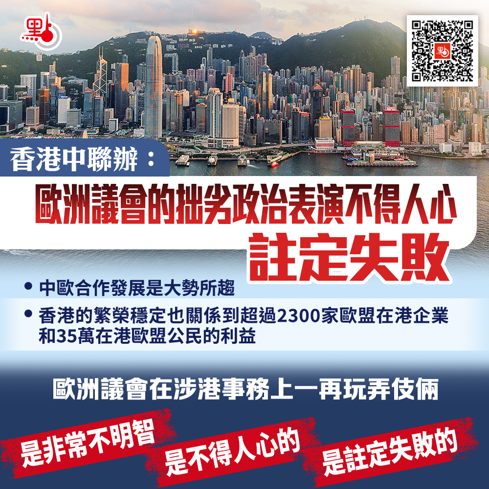 中央人民政府駐香港特別行政區聯絡辦公室發言人今日(21日)發表談話指出,歐洲議會通過顛倒黑白的所謂涉港決議,惡意抹黑「一國兩制」,肆意干涉中國內政,甚至「呼籲」歐盟對中方官員採取制裁行動,我們對這種政治操弄表示堅決反對和嚴厲譴責。發言人強調,任何外部勢力無理干涉香港事務,反覆上演這種自欺欺人的政治鬧劇是註定失敗的。