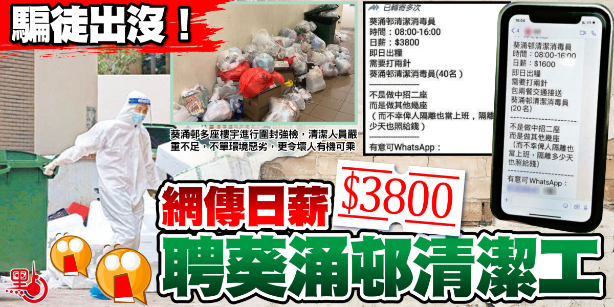 葵涌邨疫情大爆發,邨內清潔人員嚴重不足,疑有不法之徒趁機利用通訊軟件,在網上以高日薪設求職陷阱。繼23日網上瘋傳一則日薪1600元聘請「葵涌邨朝8午4清潔消毒員」訊息後,昨日再出現一則以「誇張價」日薪3800元聘請「葵涌邨清潔消毒員」的訊息。兩則招聘條件近乎相同,包括工作時間為早上8時到下午4時,標榜即日出糧,「需要打兩針」,並強調不是在「中招」大廈做清潔,而是該邨其他樓宇,又聲稱若不幸被隔離也當上班,隔離多少天也照出糧,並留有一個名叫阿穎的聯絡電話。記者致電欲聯絡阿穎,惟多次都表示電話正在使用中,無法聯絡對方了解情況。