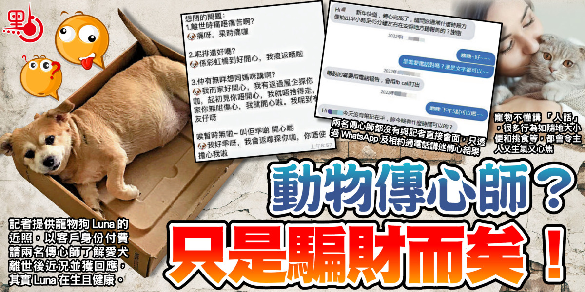 可能大家聽到動物傳心師時,都會有一種想法,就是如何理解到動物的想法,繼而把其想法告知主人,甚至為動物與主人「和解」呢?其實一切,都可能只是騙局!最近,就有傳媒以客戶身份做動物傳心「測試」,找來兩位傳心師幫忙了解「離世愛犬」(事實上仍健在)的近況。一名傳心師透過即時通訊軟件回覆記者,「佢喺彩虹橋好開心!」