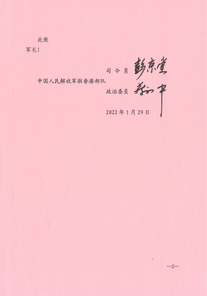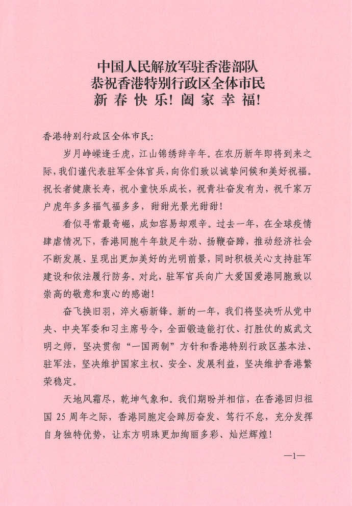 中國人民解放軍駐香港部隊今天(29日)恭祝香港特別行政區全體市民新春快樂、闔家幸福。由中國人民解放軍駐香港部隊司令員彭京堂少將、政治委員蔡永中少將署名的公開信表示,在農曆新年即將到來之際,謹代表駐軍全體官兵,向香港特別行政區全體市民致以誠摯問候和美好祝福。祝長者健康長壽,祝小童快樂成長,祝青壯奮發有為,祝千家萬戶虎年多多福氣福多多,甜甜光景光甜甜!