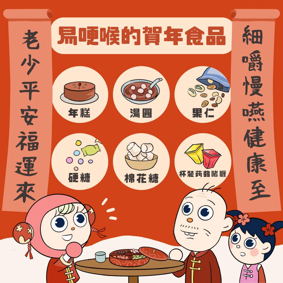 食安中心今日(1日)在facebook表示,新年面對軟糯香甜的年糕、湯圓、香脆惹味的果仁、滑嘟嘟的啫喱仔等賀年食品,如果家中有老人小孩,預備賀年食品時就要留意。因為小朋友的呼吸道及食道較細,而長者吞嚥能力可能下降,兩者咬碎或咀嚼食物的能力又不是太強,進食時一下不留神神,很容易「鯁親」,例如年糕、湯圓、果仁、硬糖、棉花糖等食物,都應小心。