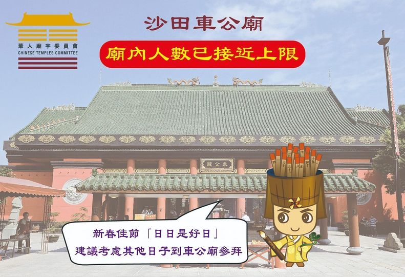 今日(3日)大年初三,有不少市民到沙田車公廟祈福,華人廟宇委員會今早10時在其社交專頁表示,沙田車公廟內人數已接近上限,建議善信考慮其他日子再到廟參拜。