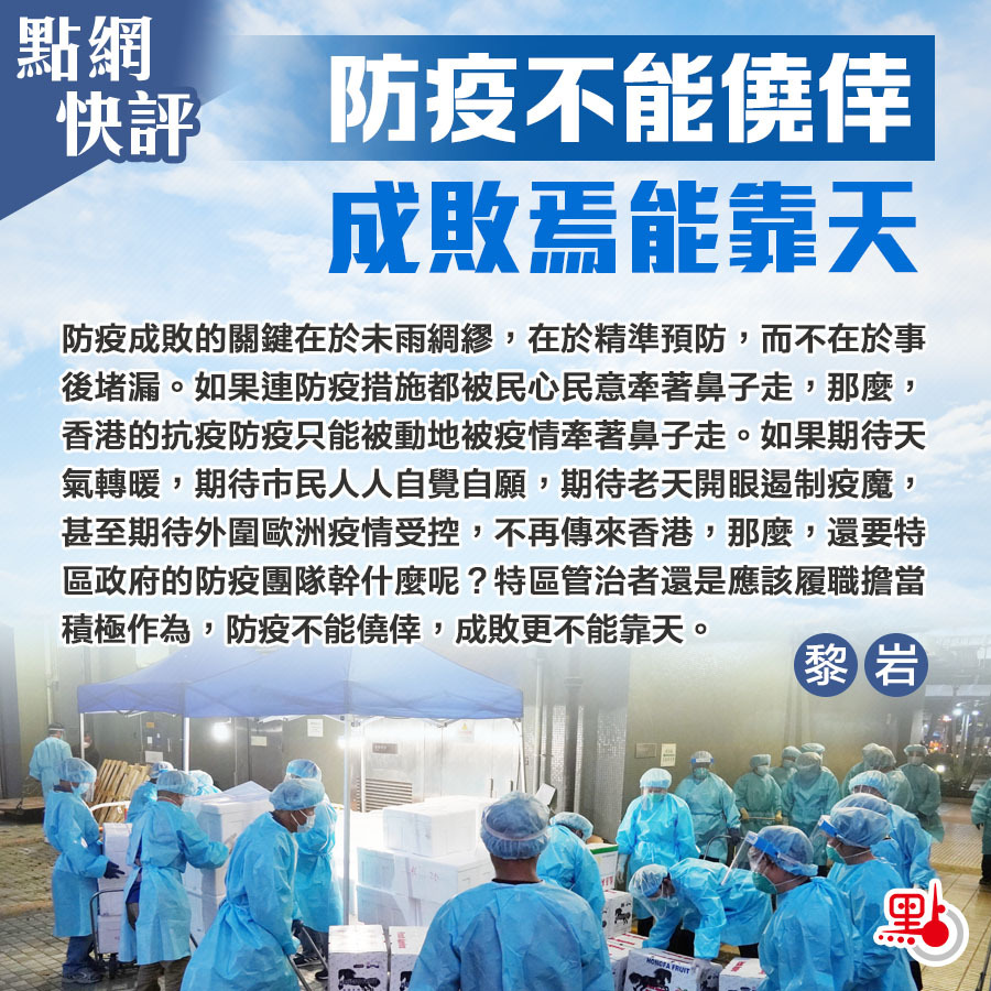 防疫成敗的關鍵在於未雨綢繆,在於精準預防,而不在於事後堵漏。如果連防疫措施都被民心民意牽著鼻子走,那麼,香港的抗疫防疫只能被動地被疫情牽著鼻子走。如果期待天氣轉暖,期待市民人人自覺自願,期待老天開眼遏制疫魔,甚至期待外圍歐美疫情受控,不再傳來香港,那麼,還要特區政府的防疫團隊幹什麼呢?特區管治者還是應該走在疫情前頭,應該履職擔當積極作為。防疫不能僥倖,成敗更不能靠天。