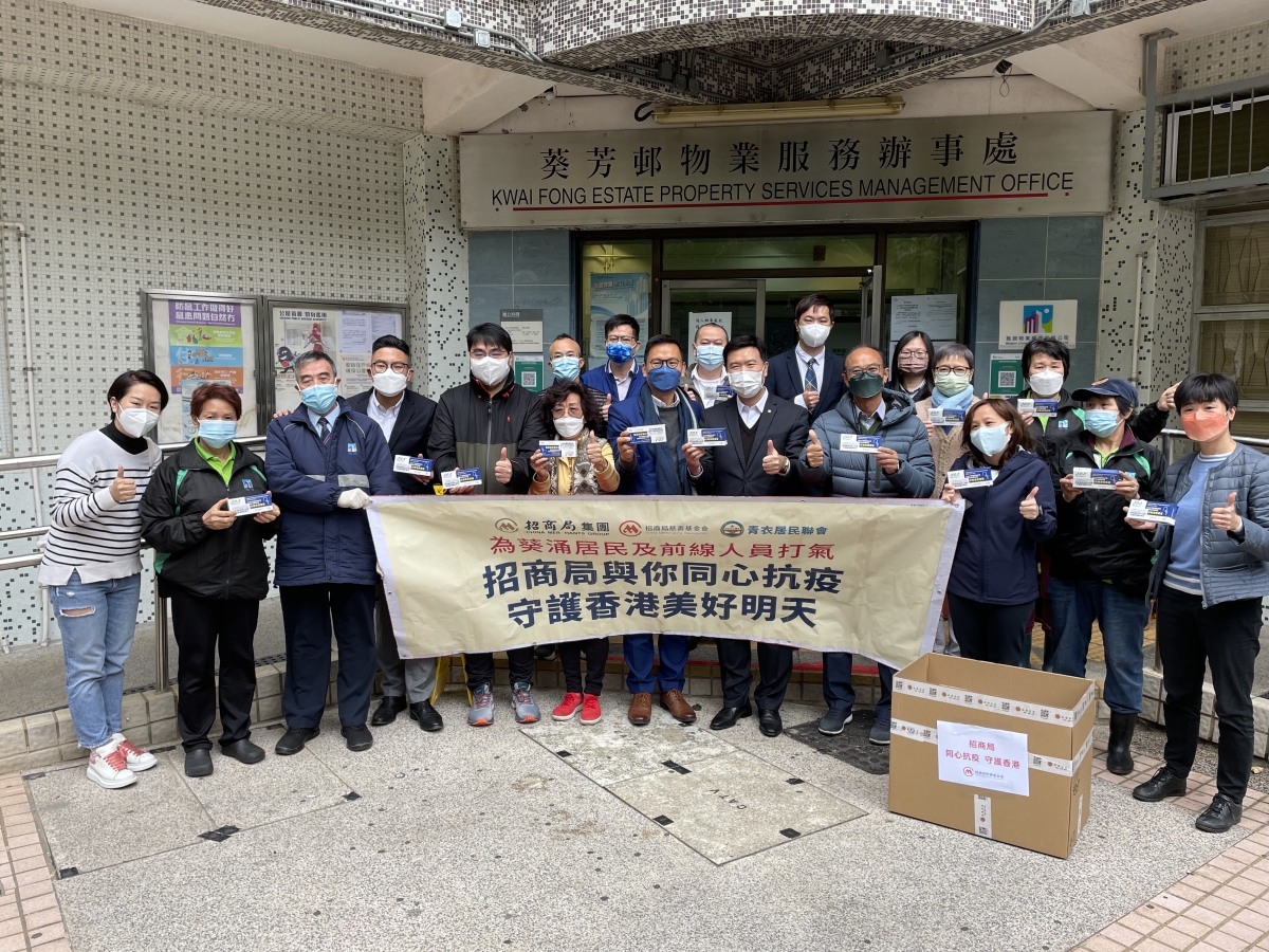 招商局集團通過招商局慈善基金會陸續捐出逾800萬元抗疫資金,針對受疫情影響的基層家庭提供經濟支持和配套的情緒關顧服務。第五波疫情爆發以來,集團再次捐款捐物,在農曆新年除夕(31日),為葵涌邨社區抗疫捐贈的5000盒自行檢測包、1000盒ASTM3口罩、1000瓶消毒噴霧等高級別防護用品送達現場。招商局港口控股公司董事總經理、立法會議員嚴剛等亦到現場派物資,為葵涌居民及前線員工打氣。