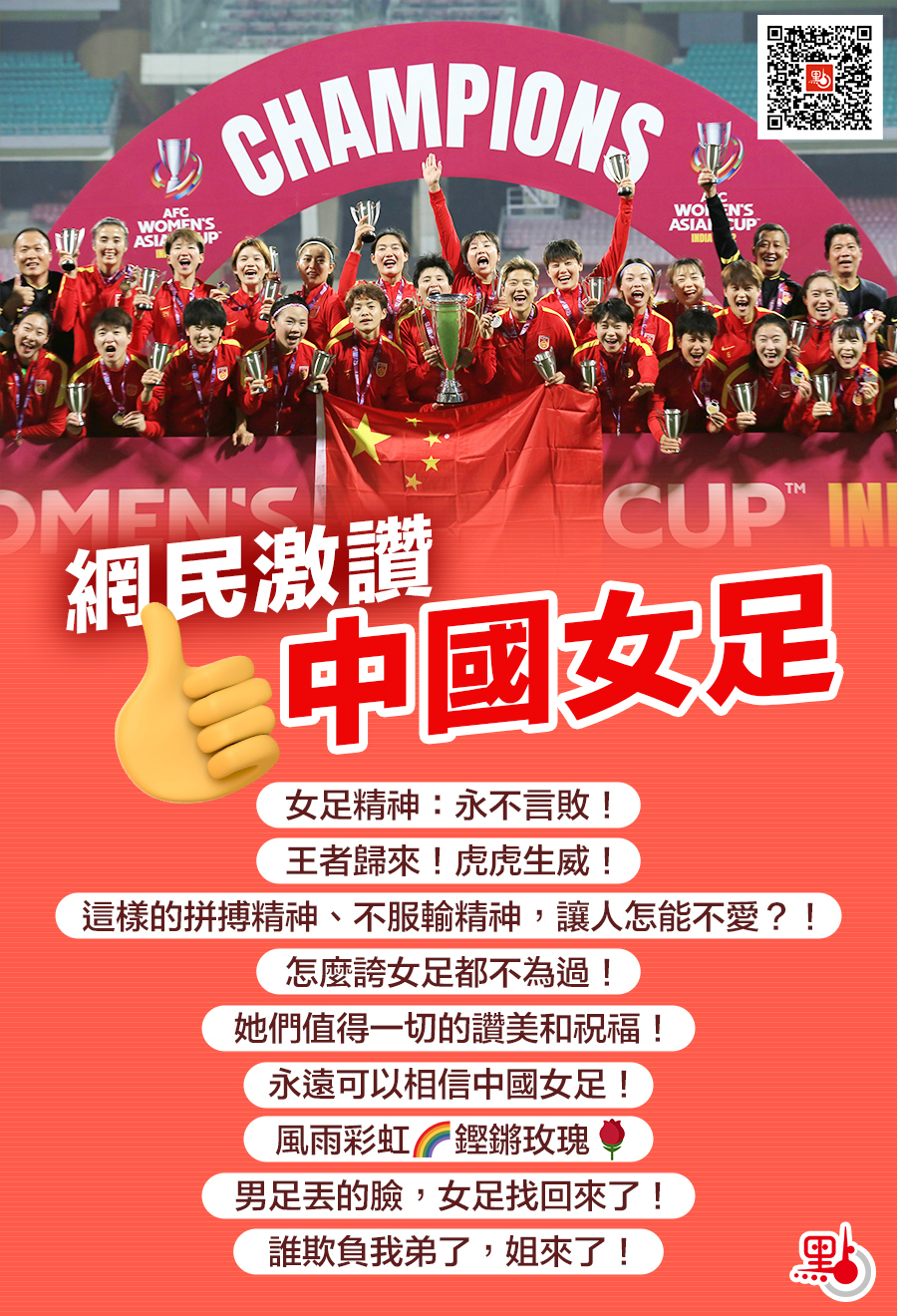 女足姑娘奪冠後,網民亦在社交平台紛紛留言,為女足點讚,分享她們重返亞洲之巔的驕傲和自豪。有網民寫到,「你永遠可以相信中國女足!」「女足精神:永不言敗!」「王者歸來!虎虎生威!」「這樣的拚搏精神、不服輸精神,讓人怎能不愛?!」「怎麼誇女足都不為過!」「她們值得一切的讚美和祝福!」「風雨彩虹鏗鏘玫瑰」「男足丟的臉,女足找回來了!」