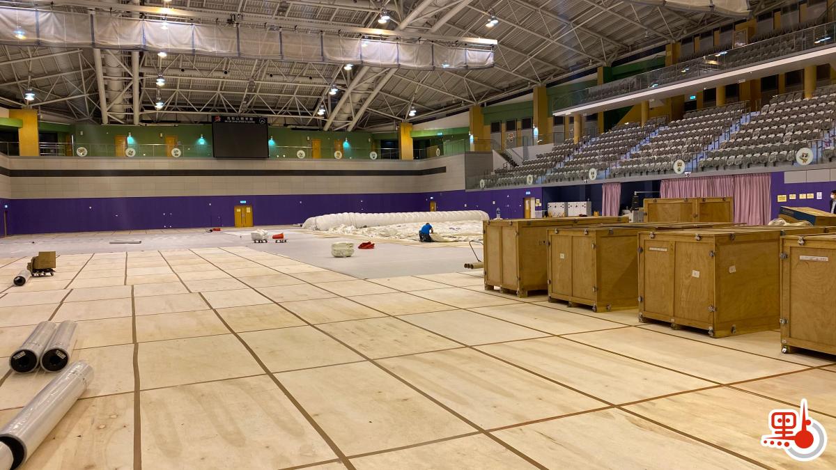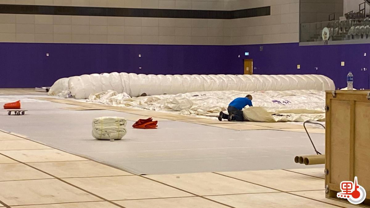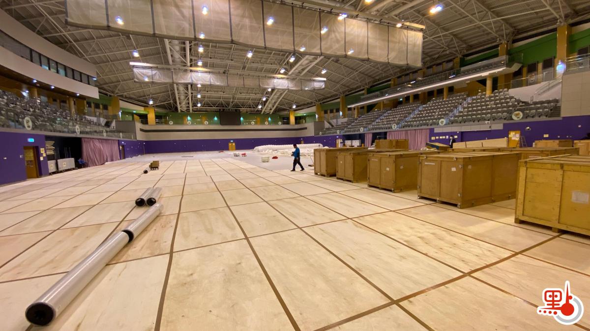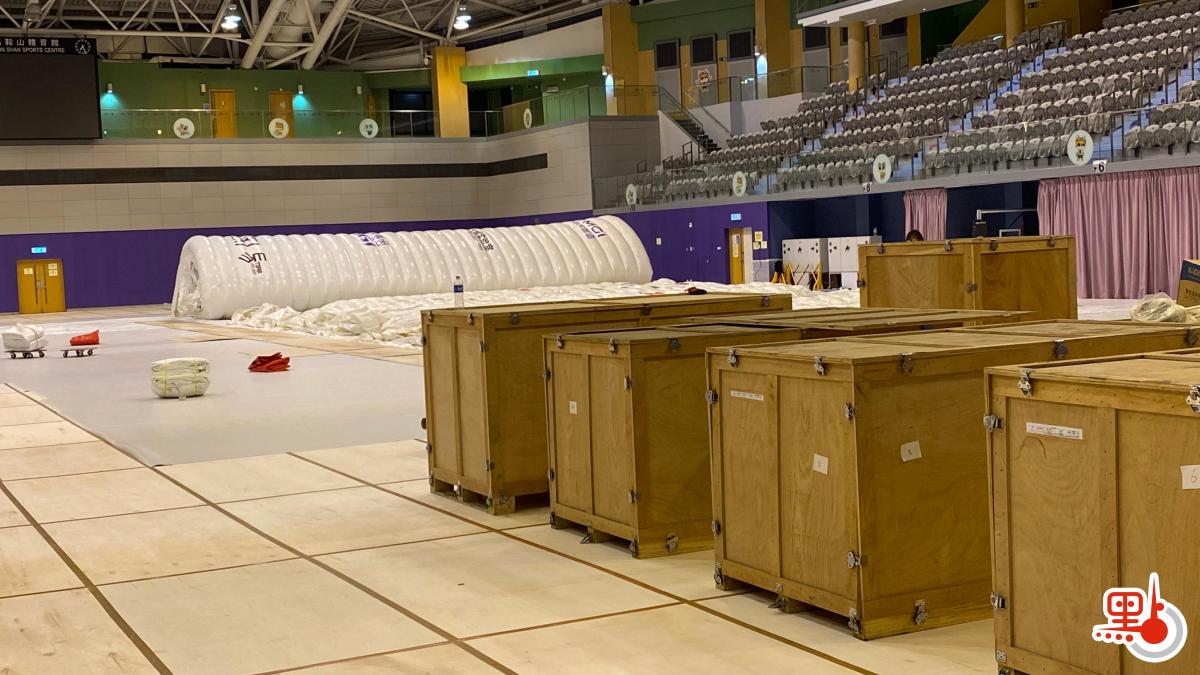 點新聞記者今晚在馬鞍山體育館現場見到,體育館內置有多個木箱,箱內物品包括木板、海棉等。「火眼實驗室」在陸續組裝當中,工作人員展開設置工作,並為場館地板鋪設保護層。