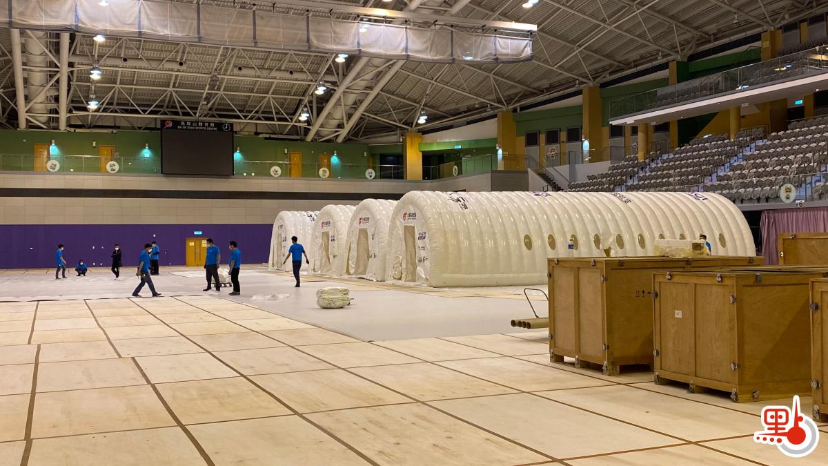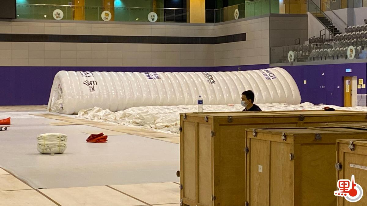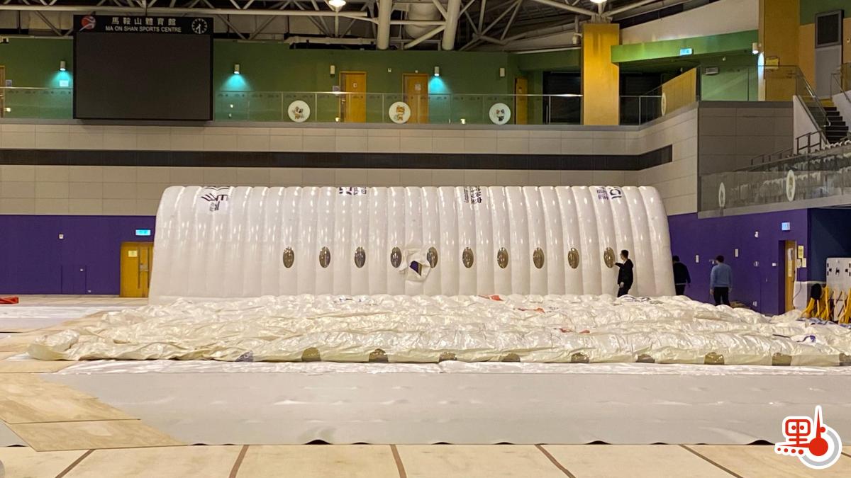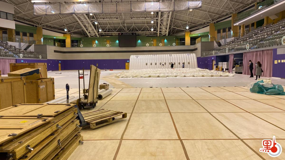 點新聞記者今晚在馬鞍山體育館現場見到,體育館內置有多個木箱,箱內物品包括木板、海棉等。「火眼實驗室」在陸續組裝當中,工作人員展開設置工作,並為場館地板鋪設保護層。